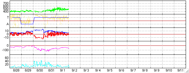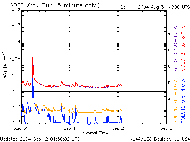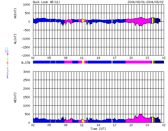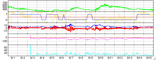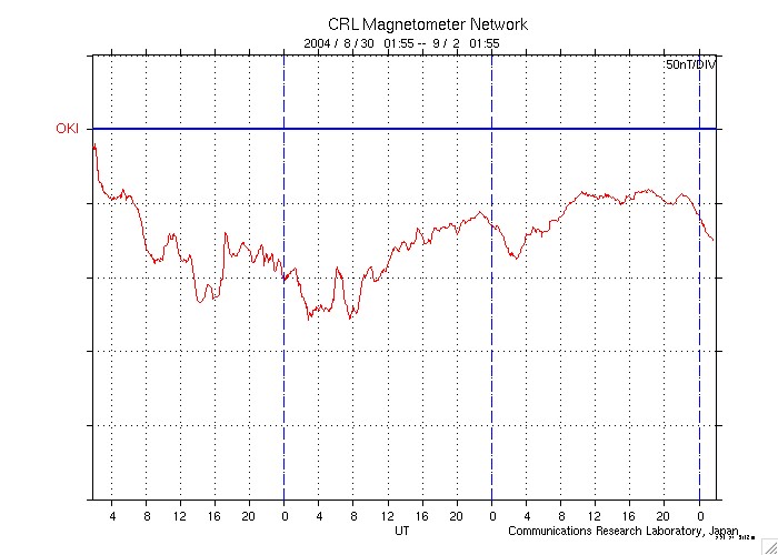 下段のAEグラフの値が高くなると、オーロラ活動が活発化しています。 (c) 京都大学, NICT ![]() 沖縄の磁場擾乱 下へ下がるほど、擾乱が発達している事を意味します。 (c) NICT ![]() SOHO衛星のMDIカメラによる太陽黒点 (c) SOHO (ESA & NASA) ![]() GOES衛星の太陽X線データ (c) NOAA/SEC ![]() | ||||||||||||||||||||||||||||||||||||||||||||||||||||||||||||
