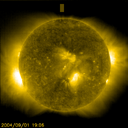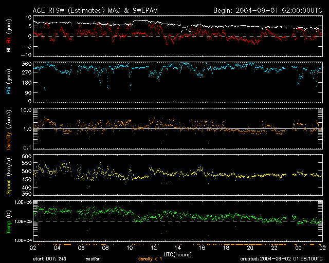 2004/ 9/ 2 11:00 更新 太陽風の速度がやや高めですが、磁気圏は静穏です。明日、CMEによる小規模の乱れが見られるかもしれません。 担当 篠原 31日14時半(世界時31日5時半)に663群で発生したM1.4の中規模フレアに伴う、 CME(太陽ガスの放出現象)についてお知らせします。 SOHO衛星のLASCO C3カメラで、CMEが飛んで行く様子が撮影されています。 今回のCMEはきれいにリング状に見えています。 このCMEは地球から見て、ほぼ真横に放出されていますので、 地球への影響は小さいでしょう。 影響があるとすると、明日の午後以降に太陽風の速度に上昇が現れると思います。 続いて、宇宙天気の現況です。 太陽風の磁気擾乱はすっかり終わりましたが、 太陽風の速度は480km/秒と通常よりやや速い状態が続いています。 SOHO EIT284カメラの太陽画像では、太陽面は比較的のっぺりとしていて、 はっきりとしたコロナホールは見られません。 従って、太陽風の速度が更に大きく上昇する事は無いと思われますが、 現在のやや高速という状態がどの程度続くのか、予測が難しくなっています。 27日前の前周期にも、数日後ですが小規模な速度上昇が見られていますので、 関連があるのかもしれません。 太陽風磁場は強度が5nT。南向きはほとんどなく、磁気圏は静穏です。 AE指数によるとオーロラ活動も目立った現象は起きていない様です。 また、沖縄の磁場変化も磁気嵐による磁場強度の減少から、 通常レベルの青線に向かって回復している様子が分かります。 太陽面では東の端に667黒点群が上って来ました。 かなり活動的かもしれないという予測もありましたが、 現在の規模は小さく、活動レベルも低い様に思われます。 現在のフレア(太陽爆発)活動は無く、穏やかです。 SOHO LASCO C3カメラによるCME。 (c) ESA & NASA ![]() SOHO衛星のEIT284カメラの映像 (c) SOHO (ESA & NASA)