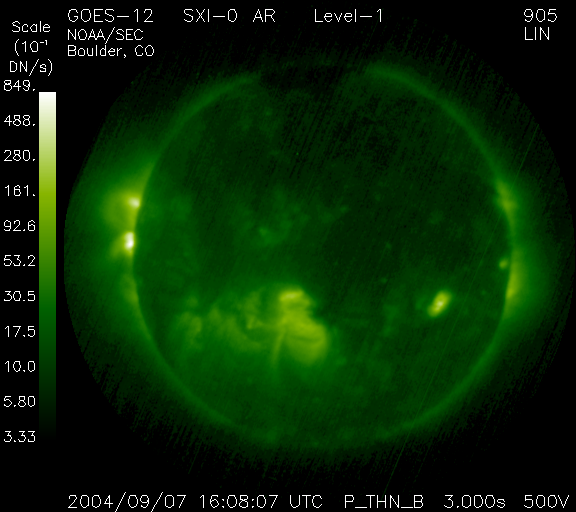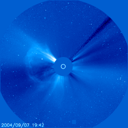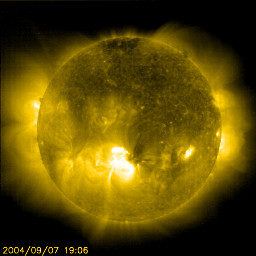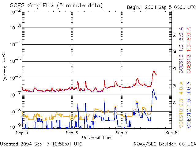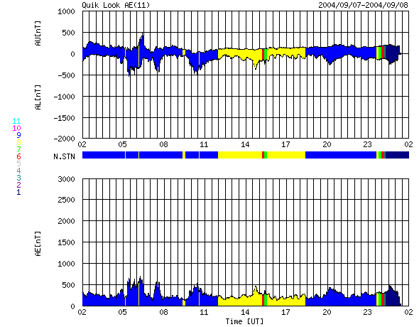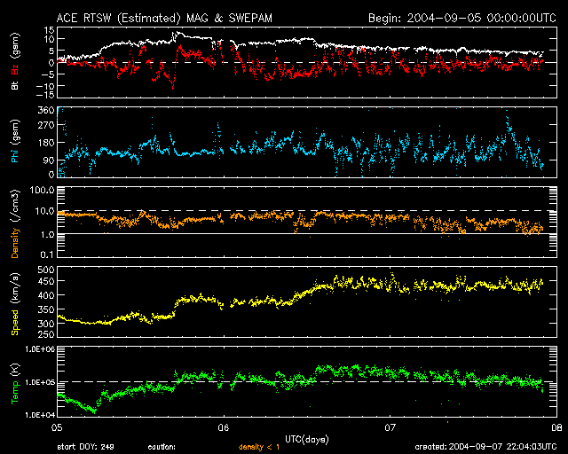 2004/ 9/ 8 10:44 更新 太陽風速度は通常レベルで安定しています。磁気圏はやや活動的です。 担当 篠原 いつもの1日幅の太陽風のプロットが停止していますので、代わりに3日幅のプロットを表示しています。 横軸に注意して下さい。 太陽風の速度は、昨日相対的にやや高まった後も430km/秒前後が続いています。 これは太陽風の速度としては通常のレベルです。 磁場強度は緩やかに低下し、5nTを切る程度に下がっています。 南向き成分がちらちらと現れる傾向は続いています。 このため、磁気圏ではオーロラ活動が弱いながらも継続的に現れています。 AE指数の変化を見ると、500nTにも達しない程度の弱い活動ですが、常時見られている様です。 SOHO EIT284の太陽画像では、コロナホールがはっきりせず、見通しを立てにくいのですが、 今後も、しばらくこの様な状態が続き、 数日経過した頃に、太陽風の速度が一段低下するという変化を示すのではないかと思います。 7日23時(世界時7日14時)頃に、太陽の東端(左端)でC2.8の小規模フレアが発生しました。 これは、まだ太陽の裏側にある活動領域が起こしたフレアの様で、 その最も高い部分が太陽の地平線越しに観測されました。 これにともなって、大規模なCME(太陽ガスの放出現象)が観測されています。 地球に対して真横を向いて放出されていますので、影響はほとんどないでしょう。 この活動領域はやがて太陽のこちら側に回って来ます。規模などに注目です。 黒点群は小さな群ばかりですが、671群が新しく現れたりしています。 やや成長している群も見られ、小・中規模フレア発生の可能性があるようです。 ACE衛星による、3日幅の太陽風の図。1列目は磁場強度(白線)と南北成分(赤線)。4列目は速度。 (c) NOAA/SEC ![]() GOES衛星の太陽X線画像による太陽フレア。8日1時(世界時7日16時) (c) NOAA/SEC ![]() GOES衛星の太陽X線データ (c) NOAA/SEC ![]() SOHO衛星のEIT284カメラの映像 (c) SOHO (ESA & NASA)