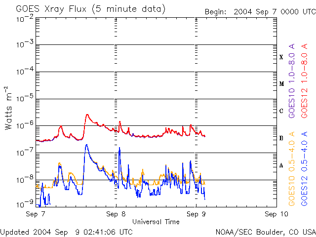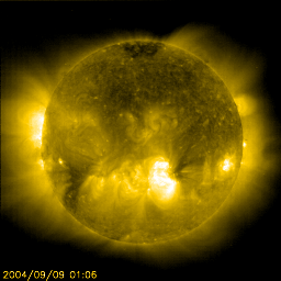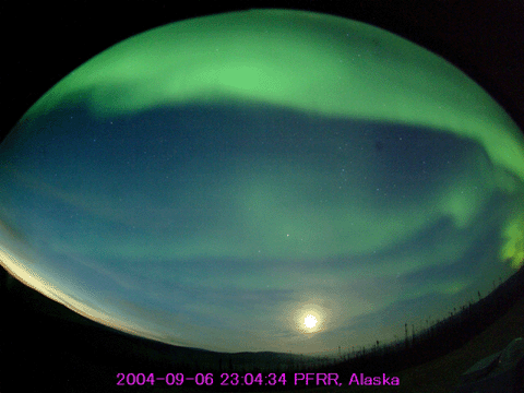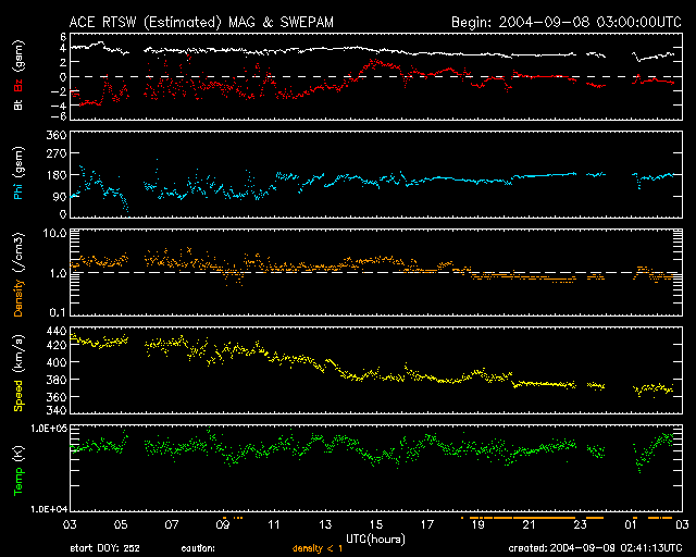 2004/ 9/ 9 11:41 更新 太陽風の速度が更に下がっています(370km/秒)。磁気圏は静かです。 担当 篠原 今日は、初めにNICT/SALMONがアラスカに設置しているオーロラライブカメラの画像を紹介します。 このカメラは春頃から設置されているのですが、 北半球の夏の間は白夜のためほとんど観測できる時間がありませんでした。 ようやくアラスカが夜を迎える季節になり、この頃は連夜の様にオーロラの画像を届けてくれています。 この動画は日本時間で一昨日の午後に観測されていた映像です。 昨日のニュースのAE指数のグラフをご覧下さい。 世界時7日の7時から8時にかけて500nT程の小さな変化が見えています。 この変化に対応するオーロラの活動だと思われます。 ライブカメラでは常時最新の画像を届けています。どうぞお楽しみ下さい。 太陽風の速度は早くも低下し、370km/秒に下がりました。通常の速度をやや下回る速度です。 磁場の強度も3nTに弱まり、擾乱の要因は減少しています。 現在の磁気圏はとても静かで、AE指数のグラフでは、後半の部分にはほとんど変化が見られません。 前半部には多少活動が見られますが、これは太陽風磁場の南向き成分の影響があったためです。 今後しばらく、穏やかな日が続きそうです。 太陽黒点は昨日とほぼ同じで、小規模な黒点群が4個見えています。 目立った活動は無く、小規模のフレアを起こす程度でしょう。 アラスカのライブカメラで撮影されたオーロラの動画。現地時間9月6日23:04〜23:26(世界時7日07:04〜07:26) (c) NICT/SALMON ![]() SOHO衛星のEIT284カメラの映像 (c) SOHO (ESA & NASA)