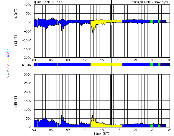 ACEが観測した太陽風の磁場(1番上の枠、白線は全体の強度、赤線は南北成分) および、太陽風の密度(3番目の橙線)、速度(4番目の黄線) (c) NOAA/SEC ![]() リアルタイムAE指数 下段のAEグラフの値が高くなると、オーロラ活動が活発化しています。 (c) 京都大学, NICT ![]() SOHO衛星のMDIカメラによる太陽黒点 (c) SOHO (ESA & NASA) ![]() GOES衛星の太陽X線データ (c) NOAA/SEC ![]() | ||||||||||||||||||||||||||||||||||||||||