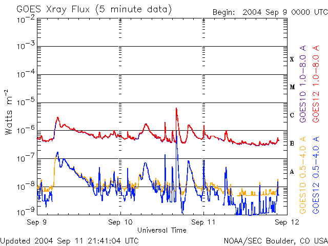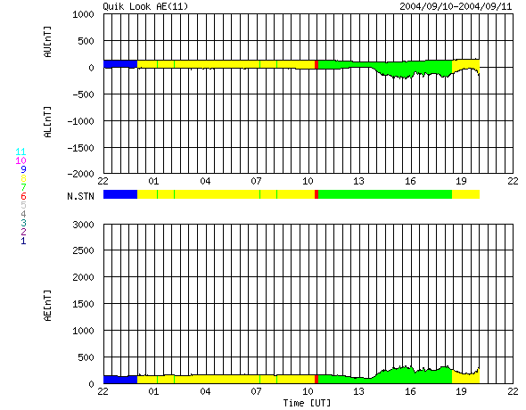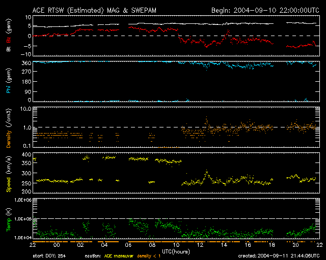 2004/ 9/12 06:46 更新 太陽風は非常に低速です。南向きが強まっているため、磁気圏が少し活動しています。フレアは穏やかです。 担当 篠原 11日19時(世界時11日10時)頃から、太陽風の磁場が大きく南を向き続けています。 強度は-5nT程度で磁気圏を乱すには十分な大きさなのですが、 もう一つの要素である太陽風の速度が270km/秒とたいへん遅いため、 AE指数をみると、250nT程度のわずかな変化が現れている程度にとどまっています。 南向き磁場はまだしばらく続きそうですが、 太陽風の速度が遅いのでオーロラ活動は小さな規模に留まるでしょう。 GOES衛星の写真を参考にすると、コロナホールが太陽の中心付近南よりに見えています。 3日後頃から太陽風の速度が上昇を始めるかもしれません。 南側に離れているため、影響は小さい可能性があります。 警戒していた太陽黒点の672群は、 一昨日から昨日にかけてCクラスの小規模フレアを頻繁に起こしました。 しかし、縮小傾向にある様子で、昨日の後半以降は活動は落ち着いています。 太陽写真に見える大きさも現状維持か、やや縮んでいる様にも見えます。 まだしばらく注意が必要ですが、心配していた程の活動度ではなさそうです。 ACEが観測した太陽風の磁場(1番上の枠、白線は全体の強度、赤線は南北成分) および、太陽風の密度(3番目の橙線)、速度(4番目の黄線) (c) NOAA/SEC ![]() リアルタイムAE指数 下段のAEグラフの値が高くなると、オーロラ活動が活発化しています。 (c) 京都大学, NICT ![]() SOHO衛星のMDIカメラによる太陽黒点 (c) SOHO (ESA & NASA) ![]() GOES衛星の太陽X線データ (c) NOAA/SEC ![]() | |||||||||||||||||||||||||||||||||||||||
