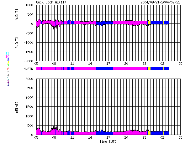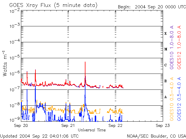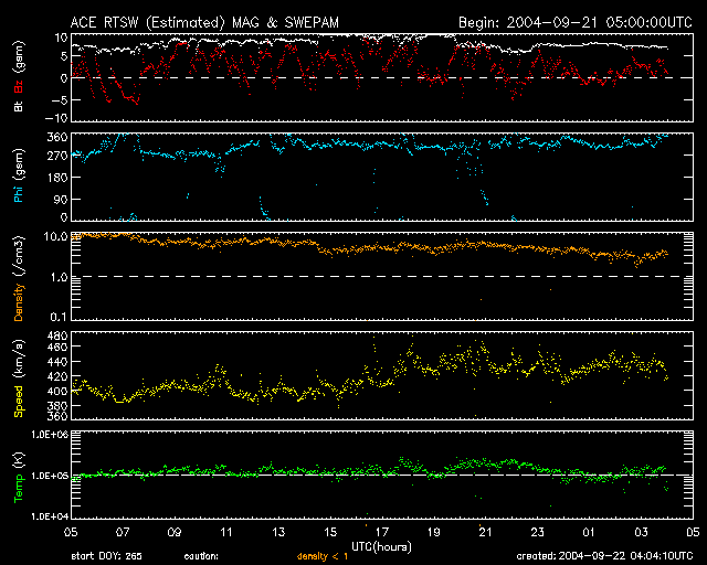 2004/ 9/22 13:05 更新 太陽風の速度がやや上昇しています。磁気圏は静穏です。今後、弱い衝撃波が来るかもしれません。 担当 篠原 太陽風の速度は緩やかに上昇して、現在440km/秒程度になっています。 磁場強度は一時10nTにまで強まりましたが、現在は7nTに下がっています。 南北成分は激しく揺れていますが、主に北寄りで、 地球磁気圏への影響は小さく、穏やかなままです。 AE指数のグラフを見ても、オーロラ活動はほとんど見られていません。 磁場強度が下がり始めていますので、コロナホールの影響による高速太陽風は この辺りが最大で、これ以降は次第に弱まって行くでしょう。 ただし、昨日お知らせしました様に、 20日1時半(世界時19日16時半)のCME(太陽ガスの放出現象)による衝撃波が これから地球にやって来ると予想されます。 おそらく到来は夜以降と思われますが、今後は注意が必要です。 擾乱の規模はあまり大きなものではないと思われます。 オーロラが活発になったり、弱い磁気嵐が発達するなどの影響が考えられます。 太陽面では、活動領域は小規模なものだけになっている様です。 Cクラスの小規模フレアが発生する程度と予想されています。 ACEが観測した太陽風の磁場(1番上の枠、白線は全体の強度、赤線は南北成分) および、太陽風の密度(3番目の橙線)、速度(4番目の黄線) (c) NOAA/SEC ![]() リアルタイムAE指数 下段のAEグラフの値が高くなると、オーロラ活動が活発化しています。 (c) 京都大学, NICT ![]() GOES衛星の太陽X線データ (c) NOAA/SEC ![]() | |||||||||||||||||||||||||||||||||||||||