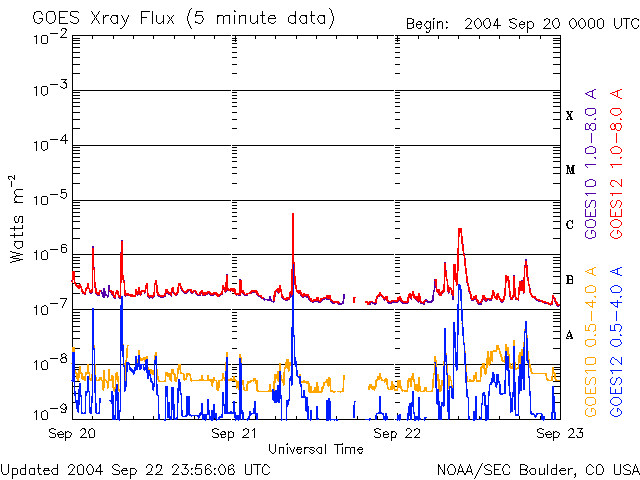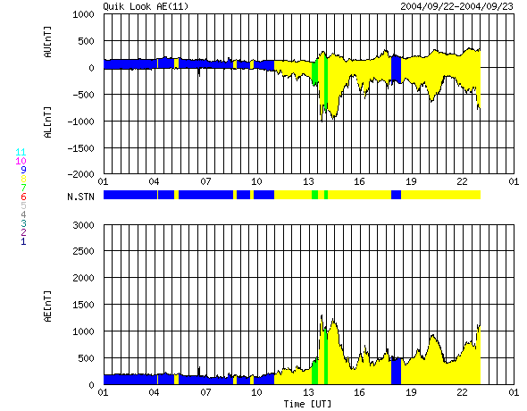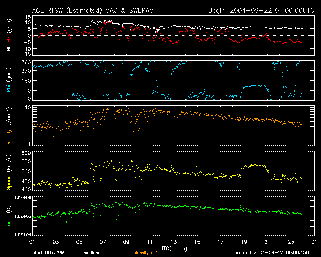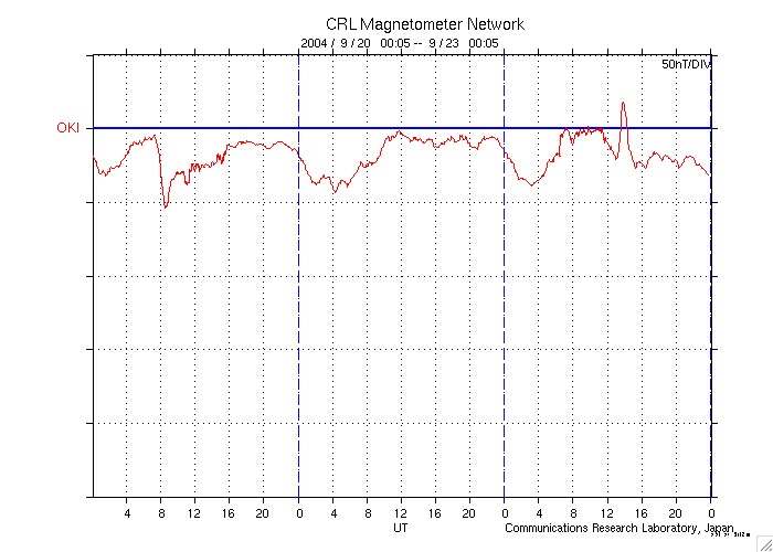2004/ 9/23 09:01 更新 太陽風の衝撃波が来ました。南向き磁場のためオーロラ活動が活発になっています。 担当 篠原 22日15時半(世界時22日6時半)頃、太陽風の衝撃波が地球に到来しました。 ACE衛星の観測によると、太陽風の速度が450km/秒から530km/秒に増加し、 磁場強度は7nTから11nTに増加しました。 衝撃波による増加量としては小幅であり、太陽風磁場も北向きだったため、 衝撃波到来後も磁気圏は穏やかでした。 その後、22日21時(世界時22日12時)頃から太陽風磁場が南向きに転じました。 (ACEデータ1列めの赤線が、プラス寄りからマイナス寄りに切り替わった) さほど強くはありませんが、-3〜-5nTの南向きがほとんど連続的に現在まで続いています。 太陽風速度も500km/秒とやや高速だったため、オーロラ活動が急に活発化しています。 AE指数のグラフを見ると、500〜1000nT程度の活動が半日近く連続的に見られています。 一方、沖縄の磁場変化を見ると目立った磁場強度の減少は見られておらず、 磁気嵐の発達には至っていません。 衝撃波に伴う擾乱ですので、これが数日に渡って続く事はありません。 太陽風の速度が400km/秒レベルに下がる、磁場強度が弱まるなどの変化とともに、 オーロラ活動は緩やかに低下していくでしょう。 GOES衛星のX線画像を調べると、現在の太陽面にはコロナホールは見られない様です。 今後しばらく穏やかな状態が続きそうです。 写真を掲載していませんが、太陽黒点も目立って活動的な群はありません。 フレア活動も穏やかの様です。 ACEが観測した太陽風の磁場(1番上の枠、白線は全体の強度、赤線は南北成分) および、太陽風の密度(3番目の橙線)、速度(4番目の黄線) (c) NOAA/SEC ![]() リアルタイムAE指数 下段のAEグラフの値が高くなると、オーロラ活動が活発化しています。 (c) 京都大学, NICT ![]() 沖縄の磁場擾乱 下へ下がるほど、擾乱が発達している事を意味します。 (c) NICT ![]() GOES衛星の太陽X線データ (c) NOAA/SEC ![]() | |||||||||||||||||||||||||||||||||||||||