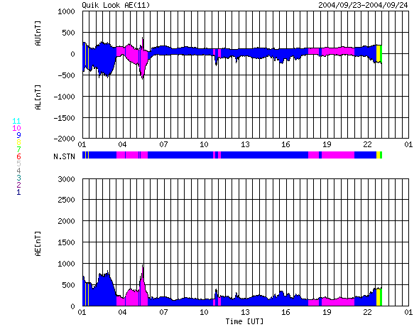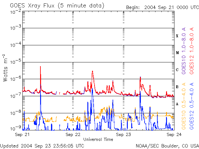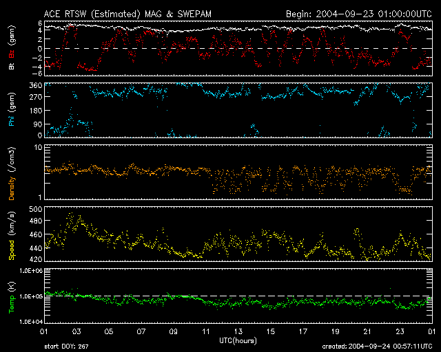 2004/ 9/24 09:58 更新 太陽風の速度はやや下がって440km/秒です。オーロラ活動は低下しています。 担当 篠原 ACE衛星の観測によると、太陽風の速度はやや下がって440km/秒前後で安定しています。 太陽風磁場の強度は5nTと昨日からほとんど変化がありませんが、 南向き成分が現れる頻度がかなり低下しています。 このためオーロラ活動は低下し、磁気圏は穏やかになっています。 この後、太陽風の速度は更に下がると思われますが、 27日前の変化を参考にすると、400km/秒の通常レベルで安定するかもしれません。 太陽風磁場が強度5nTありますので、 南向きに変化した場合は、短期的なオーロラ活動が見られそうです。 基本的には、磁気圏は静穏な状態で推移するでしょう。 太陽のフレア活動は低調です。 活動的な黒点群も見られず、静かな状態が続くでしょう。 ACEが観測した太陽風の磁場(1番上の枠、白線は全体の強度、赤線は南北成分) および、太陽風の密度(3番目の橙線)、速度(4番目の黄線) (c) NOAA/SEC ![]() リアルタイムAE指数 下段のAEグラフの値が高くなると、オーロラ活動が活発化しています。 (c) 京都大学, NICT ![]() GOES衛星の太陽X線データ (c) NOAA/SEC ![]() | |||||||||||||||||||||||||||||||||||||||