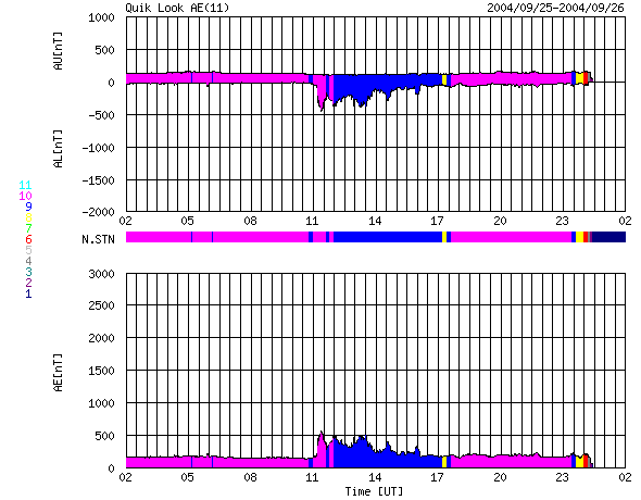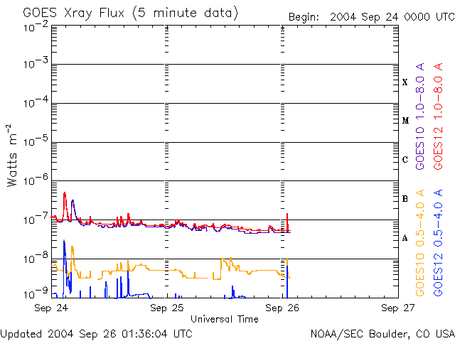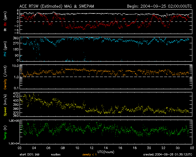 2004/ 9/26 10:37 更新 太陽風および磁気圏は穏やかです。太陽のフレア活動も見られません。 担当 篠原 太陽風の速度は一段と下がり、370km/秒になりました。 磁場強度は4nT程度と通常の強度です。 25日17時から26日0時(世界時25日8時から15時)にかけて、 一時的に太陽風磁場の南向きが続いた時間帯があり、オーロラ活動が見られました。 しかし、速度が遅いため規模は小さく、AE指数で500nTにやっと届いた程度です。 それ以外の時間帯は、地球の磁気圏はたいへん穏やかでした。 今後もこの様な穏やかな状態が続きそうですが、 GOES衛星の太陽X線画像に、とても不鮮明なのですが、 コロナホールがある様にも見えますので、 今週の前半にかけて太陽風の速度の上昇が発生するかもしれません。 太陽のフレア(太陽爆発)活動はたいへん穏やかです。 新しく675黒点群が東の端から上って来ましたが、小規模な黒点群の様です。 今後も静かな状態が続くでしょう。 ACEが観測した太陽風の磁場(1番上の枠、白線は全体の強度、赤線は南北成分) および、太陽風の密度(3番目の橙線)、速度(4番目の黄線) (c) NOAA/SEC ![]() リアルタイムAE指数 下段のAEグラフの値が高くなると、オーロラ活動が活発化しています。 (c) 京都大学, NICT ![]() GOES衛星の太陽X線データ (c) NOAA/SEC ![]() | |||||||||||||||||||||||||||||||||||||||