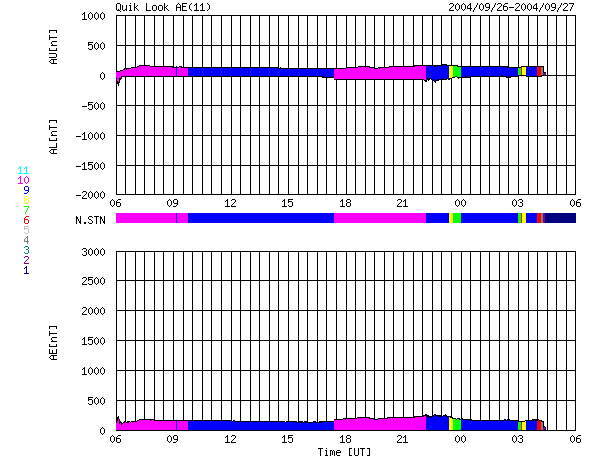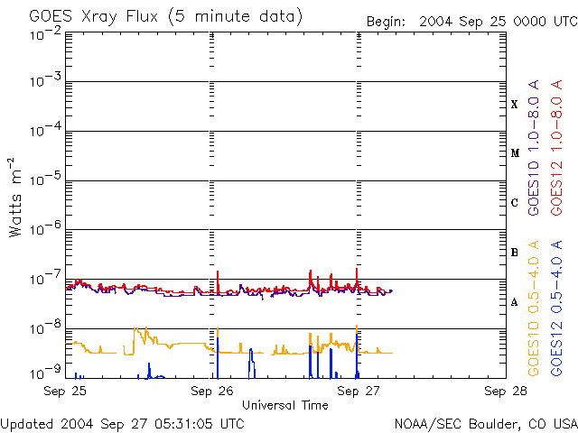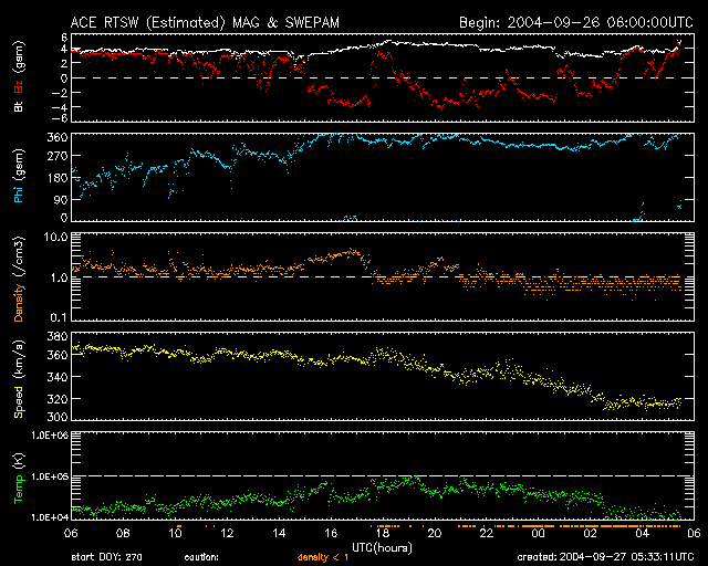 2004/ 9/27 14:33 更新 太陽風の速度は300km/秒近くまで下がっています。磁気圏は静穏です。 担当 篠原 太陽風の速度は緩やかに低下を続け、320km/秒に下がっています。 磁場強度は4nT程度あり、長時間南を向くなど変動していますが、 速度がとても下がっているため磁気圏は静穏です。 AE指数にはオーロラの活動は見られず、ほとんど平坦です。 SOHO衛星のメンテナンスは10月4日頃まで続くそうです。 まだ1週間程太陽関係の画像データが無い状態が続きます。 GOES衛星のX線画像では、コロナホールは見られない様です。 太陽面に活動的な領域もなく、磁気圏は今後も当分穏やかな状態が続きそうです。 太陽のフレア(太陽爆発)活動もとても静かです。 今後も穏やかな状態が続くでしょう。 ACEが観測した太陽風の磁場(1番上の枠、白線は全体の強度、赤線は南北成分) および、太陽風の密度(3番目の橙線)、速度(4番目の黄線) (c) NOAA/SEC ![]() リアルタイムAE指数 下段のAEグラフの値が高くなると、オーロラ活動が活発化しています。 (c) 京都大学, NICT ![]() GOES衛星の太陽X線データ (c) NOAA/SEC ![]() | |||||||||||||||||||||||||||||||||||||||