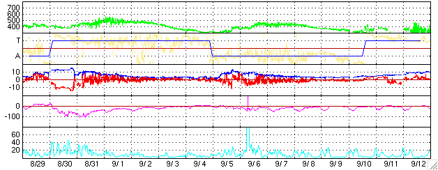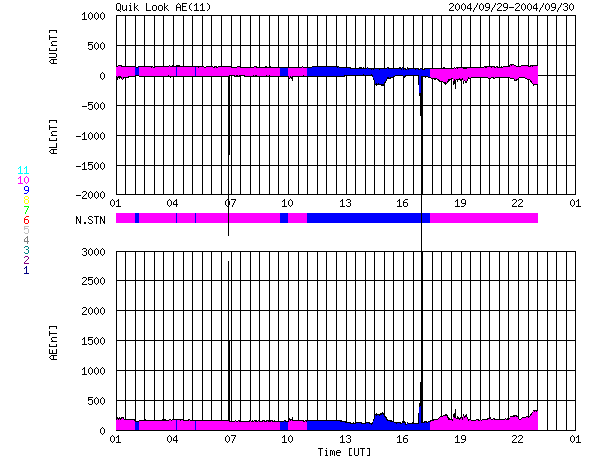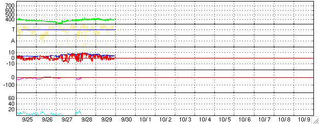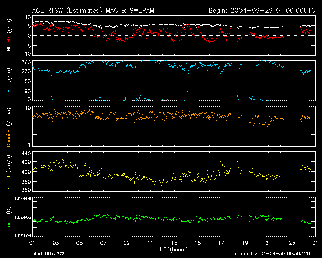 2004/ 9/30 09:35 更新 太陽風は通常の速さで、磁気圏は穏やかです。太陽のフレア活動も穏やかです。 担当 篠原 ACE衛星の観測によると、太陽風の速度は通常レベルである400km/秒で ほぼ安定した状態が続いています(ACEデータ4列め黄色線)。 磁場強度は5nTとこちらもほぼ通常のレベルです(1列めの白線)。 北寄り中心に推移していることもあり(1列めの赤線がプラス寄りで変化している)、 磁気圏は概ね穏やかです。 オーロラの活動を示すAE指数のグラフには目立った変化は起きていません。 昨日詳しく説明しましたが、 現在の太陽風は27日周期に沿った変化を示していると思われます。 これからしばらくすると、太陽風速度、磁場強度ともに緩やかに低下を始めるでしょう。 10月2日にかけて、速度が300km/秒近くにまで下がるかもしれません。 その後、次の高速風領域に当たりそうです。 それまで磁気圏は穏やかな状態が続くでしょう。 太陽黒点も小さな黒点群が2つ見られるのみです。 どちらも活動度は低く、フレア活動(太陽爆発)は見られないでしょう。 ACEが観測した太陽風の磁場(1番上の枠、白線は全体の強度、赤線は南北成分) および、太陽風の密度(3番目の橙線)、速度(4番目の黄線) (c) NOAA/SEC ![]() リアルタイムAE指数 下段のAEグラフの値が高くなると、オーロラ活動が活発化しています。 (c) 京都大学, NICT ![]() 27日の太陽周期に合わせたデータプロット (太陽風版) 太陽が同じ面を地球に向けていた27日前の変化から、今後を予想することができます。 (c) NICT