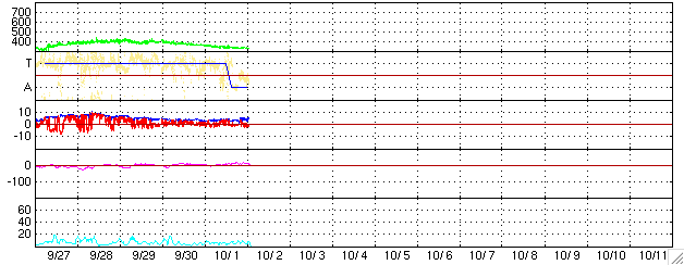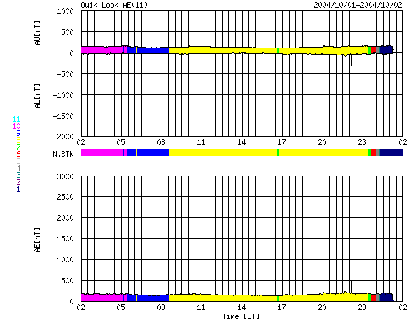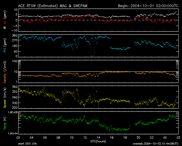 2004/10/ 2 10:45 更新 太陽風のセクター境界を越えました。太陽風は穏やかで、磁気圏も静穏です。 担当 篠原 2日1時(世界時1日16時)頃、太陽風磁場のセクター境界を越えました。 太陽風磁場の構造の大まかな境界のことで、 磁場の向きが「地球から太陽」方向から、「太陽から地球」方向に切り替わっています。 現在のところ、太陽風に目立った変化は無く、 速度は330km/秒とかなり低速、磁場強度は約5nTと通常のレベルです。 このため、磁気圏もここまでは大変静穏で、 AE指数を見るとオーロラ活動はほとんど見られなかった様です。 27日周期の図を参考にすると、これから太陽風の速度が緩やかに上昇を始め、 3日にかけて400〜500km/秒程度に上昇する可能性があります。 この弱い高速風は3日程度続きます。 その前触れとして、太陽風の磁場強度が10nT程度に強まると予想されます。 ACE衛星のリアルタイムの図では、既に上昇の兆しも見えています。 磁気圏が大きく乱れることはありませんが、オーロラの活動が活発化すると思われます。 SOHO衛星の太陽黒点画像が回復しました。 現在は、小さな黒点群が見えているだけです。 どれも活動は小さく、フレアは全く見られません。 太陽はこのまま穏やかでしょう。 ACEが観測した太陽風の磁場(1番上の枠、白線は全体の強度、赤線は南北成分) および、太陽風の密度(3番目の橙線)、速度(4番目の黄線) (c) NOAA/SEC ![]() リアルタイムAE指数 下段のAEグラフの値が高くなると、オーロラ活動が活発化しています。 (c) 京都大学, NICT ![]() 27日の太陽周期に合わせたデータプロット (太陽風版) 太陽が同じ面を地球に向けていた27日前の変化から、今後を予想することができます。 (c) NICT