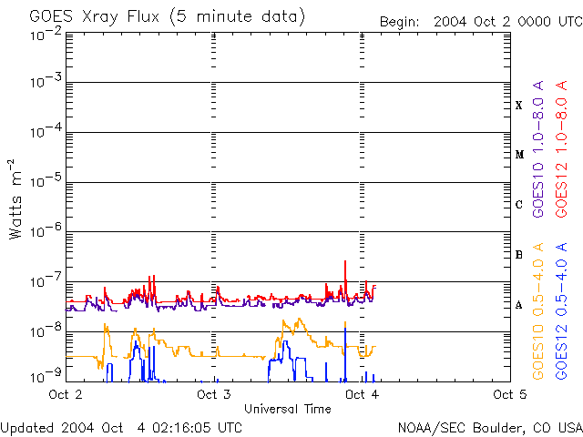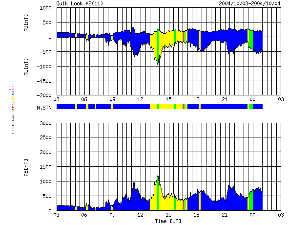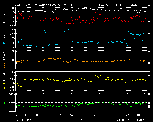2004/10/ 4 11:17 更新 太陽風磁場が南向きで推移しています。このため、オーロラ活動が活発になっています。 担当 篠原 3日15時(3日6時)から太陽風磁場の様子が変化して、南寄りが強まっています。 強まったり弱まったりと変動しながらですが、-5nT前後の南向き成分が以後連続的に見えています。 このため、磁気圏へのエネルギーの流入が増え、オーロラ活動が活発になっています。 AE指数を見ると、500nTから時に1000nT近い変化が連続的に見られていて、 オーロラの活動が続いている事が分かります。 太陽風の速度は380km/秒と通常の速度ですので、激しい乱れにまでは発達していません。 今後、この南寄り磁場がどの程度継続するかが注目点です。 太陽風の速度に上昇が見られなければ、これ以上の激しい変化に発達する事はないでしょう。 可能性は低いと思いますが、南向き磁場が続いた状態で、太陽風の速度が上昇を始めると、 磁気圏の乱れは大きくなります。 太陽黒点の写真には、3つの小さな黒点群が見えています。 フレア(太陽爆発)活動は見られていません。 このまま静かな状態が続くでしょう。 ACEが観測した太陽風の磁場(1番上の枠、白線は全体の強度、赤線は南北成分) および、太陽風の密度(3番目の橙線)、速度(4番目の黄線) (c) NOAA/SEC ![]() リアルタイムAE指数 下段のAEグラフの値が高くなると、オーロラ活動が活発化しています。 (c) 京都大学, NICT ![]() SOHO衛星のMDIカメラによる太陽黒点 (c) SOHO (ESA & NASA) ![]() GOES衛星の太陽X線データ (c) NOAA/SEC ![]() | |||||||||||||||||||||||||||||||||||||||