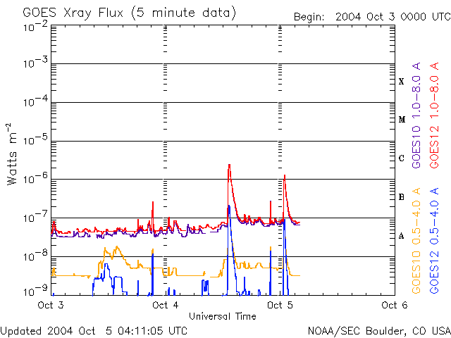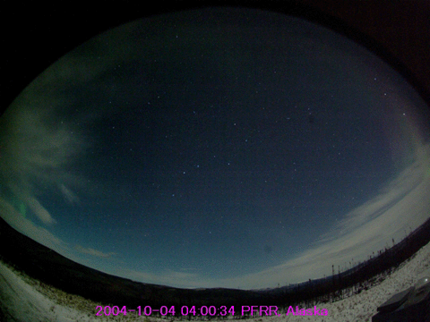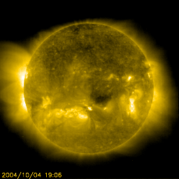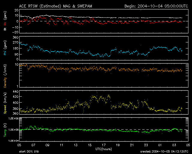 2004/10/ 5 13:13 更新 太陽風の磁場強度が下がり、オーロラ活動は弱まっています。 担当 篠原 太陽風磁場が南寄りになった影響で、オーロラ活動が活発化していましたが、 その後太陽風磁場の強度が10nTから5nT程度に弱まったことと、 強い南寄りが減った事などが影響して、オーロラ活動は弱まっています。 AE指数を見ると、500nT以下の弱い活動が続いている様です。 太陽風の速度は一時的に420km/秒まで上がりましたが、380km/秒前後と通常の速度が続いています。 アラスカのオーロラカメラが、活発なオーロラの活動を捉えています。 そのうちの、現地時間4日4時頃の映像をご紹介します。 地球規模では活動は弱まったと書いていますが、観測点の上空で活動が見られれば、 このようなきれいなオーロラを観望することができます。 写真の中心に北斗七星が、上の端には北極星が見えています。 SOHO EIT284カメラの太陽画像が久しぶりに得られました。 太陽中心やや下寄りに小さなコロナホール(暗く見えている穴)が見えています。 明日くらいに地球へ影響を及ぼす位置に来ます。 小規模なコロナホールですので、影響は限定的でしょう。 一時的に太陽風の速度が上昇する程度と思われます。 太陽黒点は小さな黒点群が3つ見えています。 どれも活動は弱いのですが、 GOES衛星のX線データを見るとCクラスの小規模フレア(太陽爆発)が2回観測されています。 これは、まだ太陽面のこちら側に上って来ていない活動領域が起こしたフレアです。 SOHO EIT284画像の左端をご覧下さい。明るく輝いている領域が見られます。 ここに活動的な黒点群があるようです。 明日、明後日ころにこちらに見える様になるでしょう。見えて来た時の規模に注目です。 アラスカのライブカメラで撮影されたオーロラの動画。現地時間10月4日04:00〜04:16(世界時4日12:00〜12:16) (c) NICT/SALMON ![]() SOHO衛星のEIT284カメラの映像 (c) SOHO (ESA & NASA)