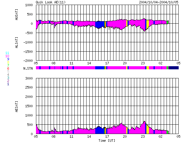 ACEが観測した太陽風の磁場(1番上の枠、白線は全体の強度、赤線は南北成分) および、太陽風の密度(3番目の橙線)、速度(4番目の黄線) (c) NOAA/SEC ![]() リアルタイムAE指数 下段のAEグラフの値が高くなると、オーロラ活動が活発化しています。 (c) 京都大学, NICT ![]() SOHO衛星のMDIカメラによる太陽黒点 (c) SOHO (ESA & NASA) ![]() GOES衛星の太陽X線データ (c) NOAA/SEC ![]() | ||||||||||||||||||||||||||||||||||||||||