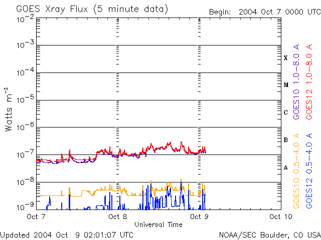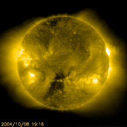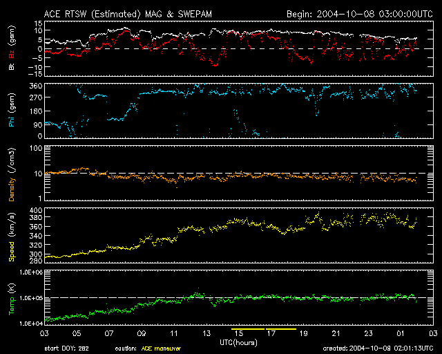 2004/10/ 9 11:01 更新 太陽風磁場のセクター境界を越え、磁場強度・速度に変化が現れています。磁気圏は静穏です。 担当 篠原 8日12時(世界時8日3時)頃、太陽風の磁場のセクター境界を越えた様です。 太陽風磁場の大まかな方向が、 「太陽から地球向き」から「地球から太陽向き」に切り替わっています。 それに伴って、太陽風の様子にも変化が見られています。 磁場の強度が10nTに強まり(現在は5nTに減少)、 速度も400km/秒に上がっています(速度としては通常のレベルです)。 ここまでは磁気圏への影響はほとんどみられず、AE指数の変化も大きなものはありません。 これ以上の速度の上昇がなければ、磁気圏は穏やかな状態が続くでしょう。 太陽風磁場が南を向く事で、弱いオーロラ活動が見られる可能性があります。 SOHO EIT284の太陽画像では、 太陽の中心やや下寄りにコロナホールが見えています(暗く見えている部分)。 もう2〜3日ほどすると、ここから吹き出している高速の太陽風が地球に当たる様になります。 その前に太陽風磁場の強度が強まって、 速度の上昇とともにオーロラ活動を活発にする可能性があります。 今後の変化に注目して下さい。 太陽面はほとんど黒点が見られない状態になっています。 GOES衛星のX線グラフもほとんど変化がなく、フレア(太陽爆発)活動はたいへん穏やかです。 SOHO衛星のEIT284カメラの映像 (c) SOHO (ESA & NASA)