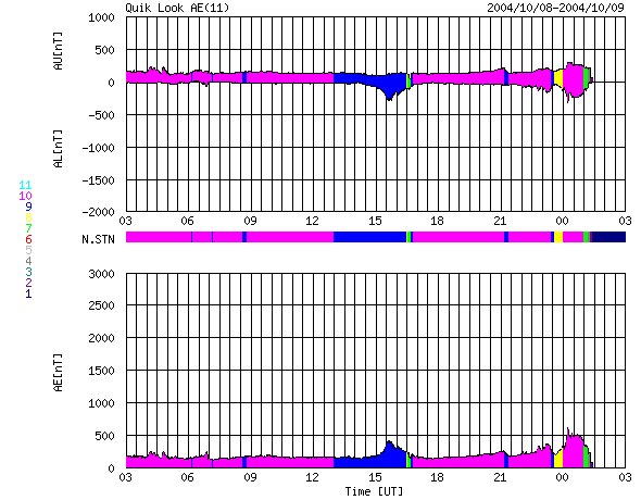 ACEが観測した太陽風の磁場(1番上の枠、白線は全体の強度、赤線は南北成分) および、太陽風の密度(3番目の橙線)、速度(4番目の黄線) (c) NOAA/SEC ![]() リアルタイムAE指数 下段のAEグラフの値が高くなると、オーロラ活動が活発化しています。 (c) 京都大学, NICT ![]() SOHO衛星のMDIカメラによる太陽黒点 (c) SOHO (ESA & NASA) ![]() GOES衛星の太陽X線データ (c) NOAA/SEC ![]() | ||||||||||||||||||||||||||||||||||||||||