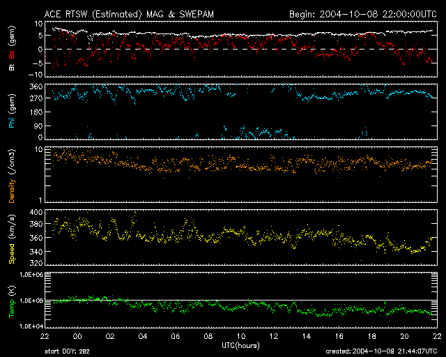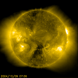 2004/10/10 06:45 更新 太陽風の速度は低下し、磁気圏は静穏です。今後、コロナホールによる高速風が来ます。 担当 篠原 400km/秒に上がっていた太陽風の速度は緩やかに低下し、 現在は340km/秒になっています(ACEデータの4列めの黄色線)。 磁場強度は5nT前後です(1列めの白線)。 掲載しているACEデータの初めと終わりの部分で、 磁場の南向きの成分(1列めの赤線がマイナスになっている)が強く見られていますが、 ここに対応する時間帯で小さなオーロラ活動が発生していた様です。 AE指数のグラフに500nT以下ですが変化が観測されています。 しかし、基本的に磁気圏はとても穏やかでした。 SOHO EIT284カメラに見えているコロナホール(太陽中心やや下の暗い部分)が、 太陽の自転によって更に西側へ進んでいます。 明日か明後日頃から、ここから吹き出している高速太陽風が地球へ当たる様になります。 それに先立つ様に太陽風の磁場が一時的に強まることが予想されます。 現在のACEデータを見ると、わずかですが、5nTから6nTへの緩やかな上昇が見られています。 今後、10nT近くへと更に上昇した場合、それに続いて太陽風の速度が上昇するでしょう。 この磁場の強まりとともに、オーロラ活動が活発になりやすいので注意して下さい。 太陽面では黒点はほとんど見られなくなっています。 GOESのX線データを見るとレベルがやや上昇し、 Cクラスの小さなフレアが2回程発生しています。 これは太陽の西側(右側)の縁近くにやや活動的な領域が発生したためです。 これから太陽の陰に隠れてしまいますので、フレア活動は再び静かになるでしょう。 SOHO衛星のEIT284カメラの映像 (c) SOHO (ESA & NASA)