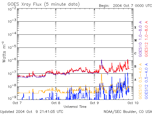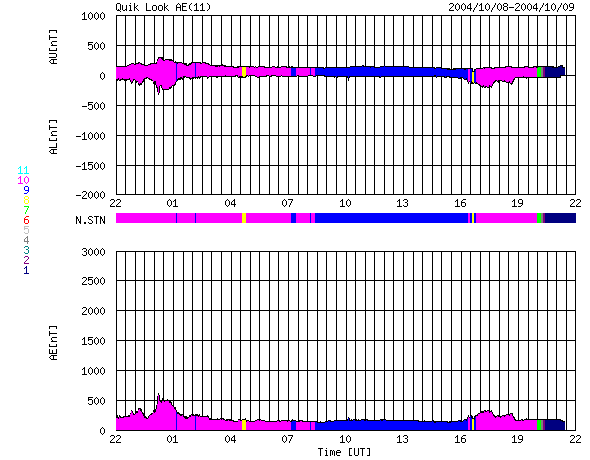 ACEが観測した太陽風の磁場(1番上の枠、白線は全体の強度、赤線は南北成分) および、太陽風の密度(3番目の橙線)、速度(4番目の黄線) (c) NOAA/SEC ![]() リアルタイムAE指数 下段のAEグラフの値が高くなると、オーロラ活動が活発化しています。 (c) 京都大学, NICT ![]() SOHO衛星のMDIカメラによる太陽黒点 (c) SOHO (ESA & NASA) ![]() GOES衛星の太陽X線データ (c) NOAA/SEC ![]() | ||||||||||||||||||||||||||||||||||||||||