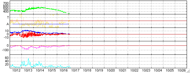 GOES衛星による、静止衛星軌道における高エネルギー電子の変化 (c) NOAA/SEC ![]() ACEが観測した太陽風の磁場(1番上の枠、白線は全体の強度、赤線は南北成分) および、太陽風の密度(3番目の橙線)、速度(4番目の黄線) (c) NOAA/SEC ![]() リアルタイムAE指数 下段のAEグラフの値が高くなると、オーロラ活動が活発化しています。 (c) 京都大学, NICT ![]() 27日の太陽周期に合わせたデータプロット (太陽風版) 太陽が同じ面を地球に向けていた27日前の変化から、今後を予想することができます。 (c) NICT