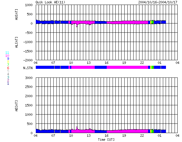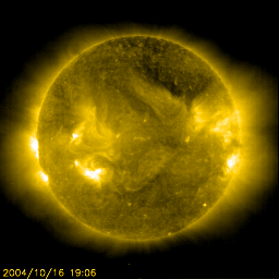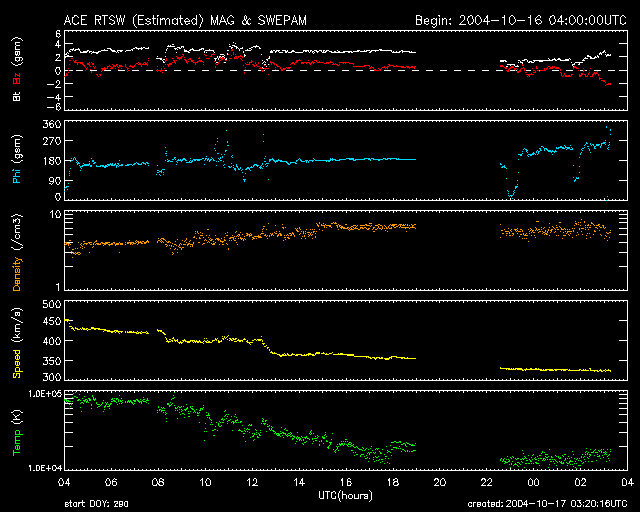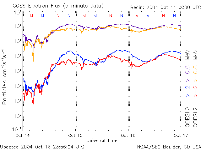 2004/10/17 12:20 更新 放射線帯高エネルギー電子が多い状態が続いています。太陽風、磁気圏は静穏です。 担当 篠原 放射線帯の高エネルギー電子密度の高い状態が続いています。 GOES衛星の観測によると、昨日も密度はわずかですが増加し、 青線(GOES10)と赤線(GOES12)が、共に警戒ラインである10の4乗の線を越えています。 高エネルギー電子は磁気圏の乱れが発生しなければ、数日かけて緩やかに減少するだけです。 衛星運用では、しばらく注意が必要でしょう。 太陽風は、引き続き緩やかに速度が低下し続け、320km/秒とかなり遅くなっています。 磁場強度も1〜3nTにまで弱まり、擾乱の要因はほとんどなくなっています。 AE指数のグラフにはほとんど変化が観測されておらず、 オーロラ活動はとても低調だった様です。 27日周期の図をご覧下さい。 前周期の太陽風の変化を見ると、9月20日にセクターの切り替わりが発生し、 その後、磁場南北成分の激しい振動と、小幅ですが速度の上昇が現れています。 この変化が今周期も繰り返されると考えると、 明日以降にセクターの切り替わりが観測され、 続いて磁場の振動、太陽風速度の上昇が始まると予想されます。 この変化に伴って、オーロラ活動が2〜3日程度活発化することが考えられます。 明日以降の太陽風の変化に注目して下さい。 太陽のフレア活動も目立った変化はありません。 682黒点群の姿がはっきり見えています。 規模に変化はなく、小規模フレアへの注意が必要な程度です。 SOHO衛星のEIT284カメラの映像 (c) SOHO (ESA & NASA)