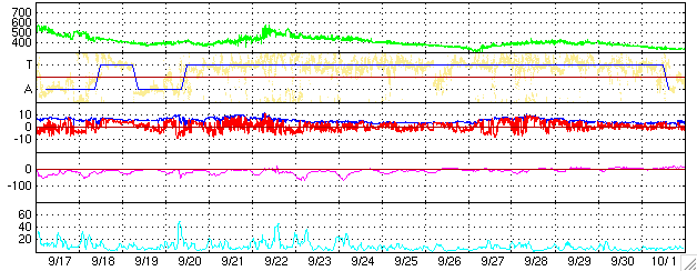 ACEが観測した太陽風の磁場(1番上の枠、白線は全体の強度、赤線は南北成分) および、太陽風の密度(3番目の橙線)、速度(4番目の黄線) (c) NOAA/SEC ![]() 27日の太陽周期に合わせたデータプロット (太陽風版) 太陽が同じ面を地球に向けていた27日前の変化から、今後を予想することができます。 (c) NICT
