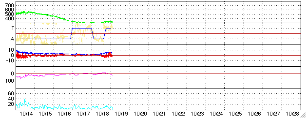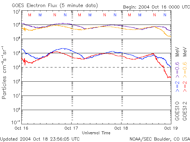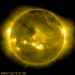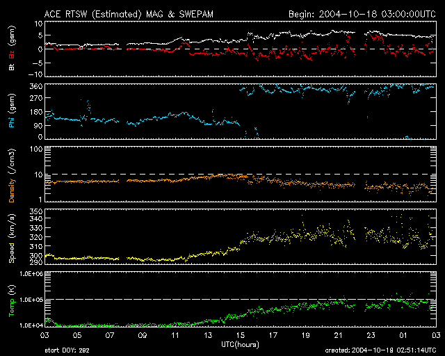 2004/10/19 11:51 更新 太陽風の磁場がやや強まり、速度にもわずかな変化が見られています。磁気圏は穏やかです。 担当 篠原 ACE衛星の観測によると、太陽風の磁場強度がやや強まって5nTに上がっています。 速度もわずかに320km/秒へ上昇が見られています。 変化の幅としては小さく、磁気圏も静穏な状態が続いています。 27日周期の図を参考にすると、太陽風の磁場強度や速度の変化に対する注意は もう2日程度必要と思われます。 ただ、変化の量は小規模なものに留まりそうですので、 オーロラがいくらか活発になる程度ではないでしょうか。 SOHO EIT284の太陽画像では、 小さなコロナホールが太陽の中心やや左上に見えています(やや暗く見えている部分)。 ここから吹き出している高速の太陽風が4日程度経つと地球に当たる様になります。 オーロラ活動が活発になったり、小規模の磁気嵐を発生させるかもしれません。 擾乱は3日程度続く可能性があります。 放射線帯の高エネルギー電子は大きく減少し、警戒域から下がっています。 太陽風の変動の影響を受けた様です。 太陽面は、小規模なものばかりですが黒点群でにぎやかに変わっています。 まだ番号が付けられていませんが、682〜686群まで5群に増えています。 いずれも活動は小規模で、フレア(太陽爆発)はほとんど観測されていません。 SOHO衛星のEIT284カメラの映像 (c) SOHO (ESA & NASA)