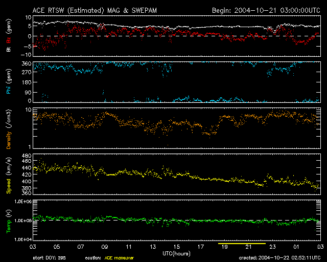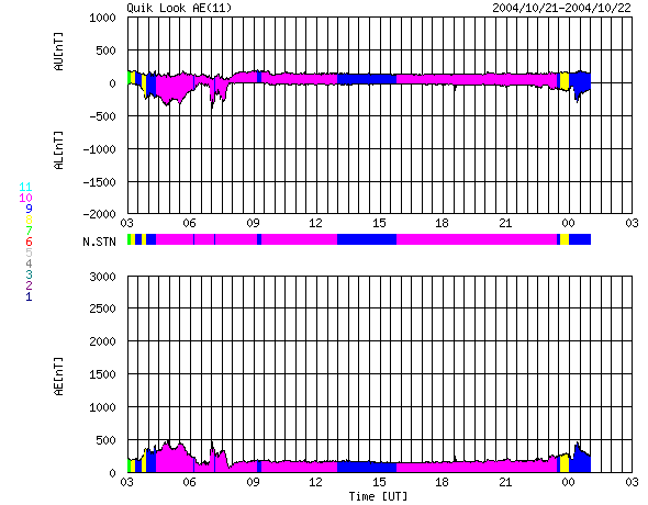 SOHO衛星のMDIカメラによる太陽黒点 (c) SOHO (ESA & NASA) ![]() GOES衛星の太陽X線データ (c) NOAA/SEC ![]() ACEが観測した太陽風の磁場(1番上の枠、白線は全体の強度、赤線は南北成分) および、太陽風の密度(3番目の橙線)、速度(4番目の黄線) (c) NOAA/SEC ![]() リアルタイムAE指数 下段のAEグラフの値が高くなると、オーロラ活動が活発化しています。 (c) 京都大学, NICT ![]() | |||||||||||||||||||||||||||||||||||||||||||