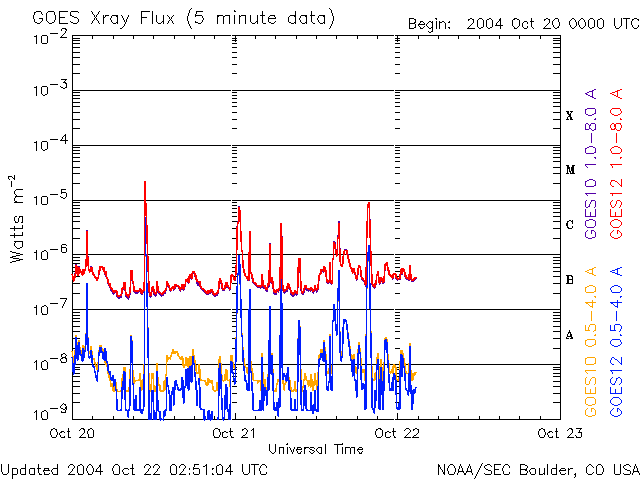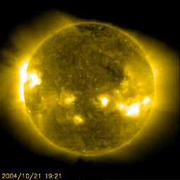 2004/10/22 11:53 更新 682、687黒点群が活発にフレアを起こしています。太陽風の速度はやや下がり、磁気圏は穏やかです。 担当 篠原 太陽面で黒点群が増え、にぎやかになっています。 中でも、682、687の黒点群が活発に小・中規模のフレア(太陽爆発)を起こしています。 この両群は規模を拡大しており、今後も中規模のフレアに対する注意が必要です。 今朝、22日4時半(世界時21日19時半)に687群がC9.9の小規模フレアを発生させました。 これに伴って、CME(太陽ガスの放出現象)が観測されています。 SOHO C3カメラの画像をご覧下さい。 太陽の左上からガスが放出されつつある様子が撮影されています。 発生箇所がかなり東に(左に)外れていますので、地球への影響は無いと思われますが、 2〜3日後に太陽風の速度に多少の変化が見られるかもしれません。 太陽風は、今回の擾乱は一息ついた様で、磁場強度が下がるとともに、 太陽風の速度も緩やかに低下し、現在は400km/秒に下がっています。 オーロラ活動も低下し、小規模な変化がAE指数に見られている程度です。 しかし、現在も磁場強度、太陽風速度ともに通常のレベルを保っていますので、 太陽風磁場が南向きに変わると、オーロラの活動が強まる可能性があります。 また、小規模ですがコロナホールが地球に影響を及ぼす位置に達しており、 今日、明日の太陽風の変化にも注意が必要です。 SOHO衛星のEIT284カメラの映像 (c) SOHO (ESA & NASA)