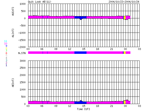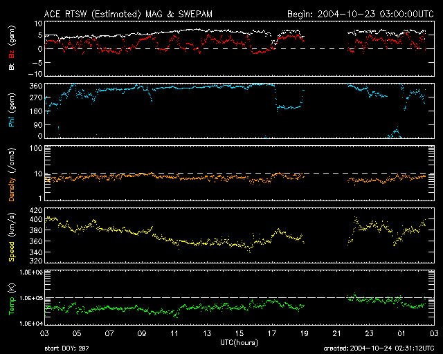 GOES衛星の太陽X線データ (c) NOAA/SEC ![]() SOHO衛星のMDIカメラによる太陽黒点 (c) SOHO (ESA & NASA) ![]() ACEが観測した太陽風の磁場(1番上の枠、白線は全体の強度、赤線は南北成分) および、太陽風の密度(3番目の橙線)、速度(4番目の黄線) (c) NOAA/SEC ![]() リアルタイムAE指数 下段のAEグラフの値が高くなると、オーロラ活動が活発化しています。 (c) 京都大学, NICT ![]() | ||||||||||||||||||||||||||||||||||||||||