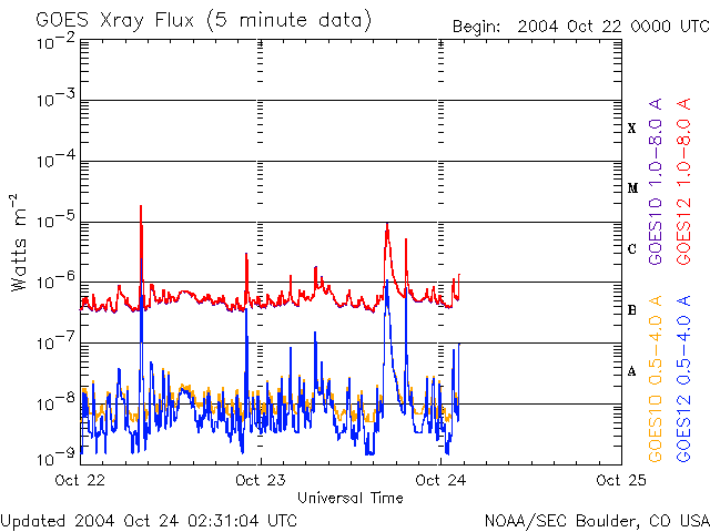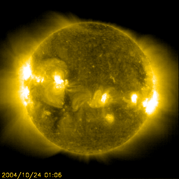 2004/10/24 11:31 更新 687黒点群は小規模フレアを起こし続けています。太陽風、磁気圏は穏やかです。 担当 篠原 687黒点群は引き続き活発で、今日、24日1時(世界時23日16時)にC9.9、 24日4時(世界時23日19時)にC8.0のそれぞれ大きめの小規模フレアを起こしてます。 C9.9のフレアは比較的長時間の継続時間を持つタイプで、 このフレアによるCME(太陽ガスの放出現象)が発生している可能性があります。 次第に太陽の中心に向かって来ていますので、 CMEが発生した場合、地球へ影響を及ぼす可能性も高まっています。 687黒点群は現在も勢力を保っており、引き続き中規模フレアに対する注意が必要です。 現在の太陽風は、速度380km/秒、磁場強度5nTで通常のレベルです。 南北成分の変化を見ると、北寄りに推移しています。 このためオーロラ活動はかなり低調で、AE指数にはほとんど変化が見られません。 引き続き太陽風は同程度の状態が続きそうです。 磁場強度、速度ともにそれなりにありますので、磁場が南向き傾向に変われば、 オーロラ活動がやや活発になることもあるでしょう。 また、ここ数日、687群が数度に渡ってCMEを起こしています。 太陽の端の方で起こしたCMEで、直接地球に向かっていないため、 ほとんど影響は見られないでしょうが、短期的な乱れが観測されることも予想されます。 SOHO衛星のEIT284カメラの映像 (c) SOHO (ESA & NASA)