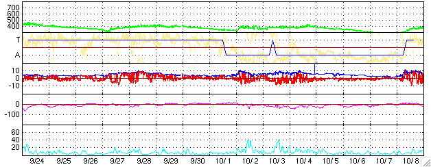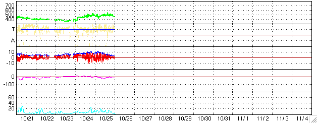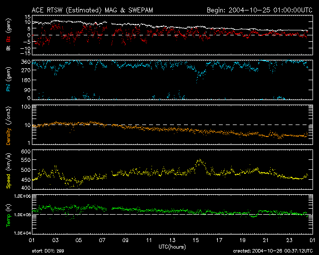 SOHO衛星のMDIカメラによる太陽黒点 (c) SOHO (ESA & NASA) ![]() GOES衛星の太陽X線データ (c) NOAA/SEC ![]() ACEが観測した太陽風の磁場(1番上の枠、白線は全体の強度、赤線は南北成分) および、太陽風の密度(3番目の橙線)、速度(4番目の黄線) (c) NOAA/SEC ![]() 27日の太陽周期に合わせたデータプロット (太陽風版) 太陽が同じ面を地球に向けていた27日前の変化から、今後を予想することができます。 (c) NICT