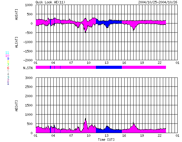 下段のAEグラフの値が高くなると、オーロラ活動が活発化しています。 (c) 京都大学, NICT ![]() | ||||||||||||||||||||||||||||||||||||||||||||||||||||||||