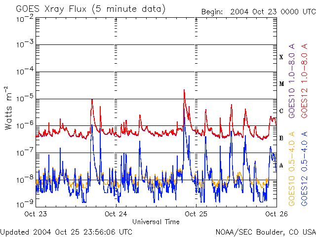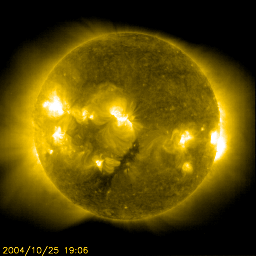 2004/10/26 09:38 更新 太陽はフレア活動を活発に続けています。太陽風の速度は次第に低下するでしょう。 担当 篠原 今日は太陽黒点の最新画像を掲載しています。 7つの黒点群が現れていて、とてもにぎやかです。 この中で、687群と691群の活動度が高く、 昨日のニュース以降もCクラスの小規模フレアを687群が6回、691群が1回起こしています。 691群は規模を拡大しつつありますので、今後は更に活発になる可能性もあります。 今後も、Mクラスの中規模フレアに対する注意が必要です。 太陽風の速度は480km/秒前後が続いていましたが、 現在は450km/秒になり、下がり始めた様子です。 昨日の磁場強度の変化を見ると、10nTから3nT程度へ緩やかに低下を続けており、 高速太陽風のピークは越えた様です。 27日周期の図も参考にすると、今日から明日にかけて速度は次第に低下していくと思われます。 磁場強度が下がって来た事もあり、磁気圏は比較的穏やかで、 オーロラ活動もAE指数で500nT規模の小規模の活動が2回見られた程度です。 今後は更に穏やかになるでしょう。 SOHO EIT284の太陽画像では、太陽面の中心から下に向かって、 黒い裂け目の様にコロナホールが見えています。 これから3日ほど経つと地球へ影響を及ぼす位置に来ます。 27日周期の図を参考にすると、28日から29日頃に太陽風磁場のセクター境界を越え、 続いて磁場強度が強まってくる事が予想されます。 引き続き太陽風速度に上昇が見られるでしょう。 この影響で29、30日頃に磁気圏のオーロラ活動が強まる可能性があります。 SOHO衛星のEIT284カメラの映像 (c) SOHO (ESA & NASA)