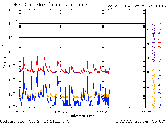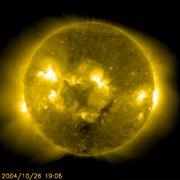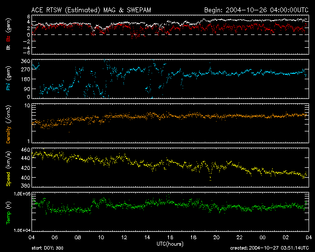 2004/10/27 12:51 更新 太陽風は通常の状態で、磁気圏は穏やかです。フレア活動はやや落ち着いています。 担当 篠原 ACE衛星の観測によると、太陽風の速度は400km/秒、磁場強度は4nTで通常の状態です。 磁場の南北成分(ACEデータの1列めの赤線)を見ると、ほとんど北寄り(プラス方向)が続いています。 このため、磁気圏は大変穏やかです。 AE指数のグラフには全く変化が見られず、オーロラ活動はほとんど見られなかった様です。 太陽風はもう1〜2日程度、穏やかな状態が続くと予想されます。 SOHO EIT284カメラの太陽画像を見ると、 中央下寄りに縦に延びたコロナホールが見えます(暗い部分です)。 このコロナホールの影響などで、28、29日頃から太陽風に乱れが発生すると思われます。 その前に、太陽風磁場に乱れが始まりますので、注意して下さい。 このところ活発に続いていた太陽フレア(太陽爆発)の活動ですが、 昨日からやや落ち着いてきた様です。 昨日は、C1からC2の小さな小規模フレアが発生するだけでした。 太陽面の黒点群は現在もにぎやかで、687群、691群には引き続き注意が必要でしょう。 SOHO衛星のEIT284カメラの映像 (c) SOHO (ESA & NASA)