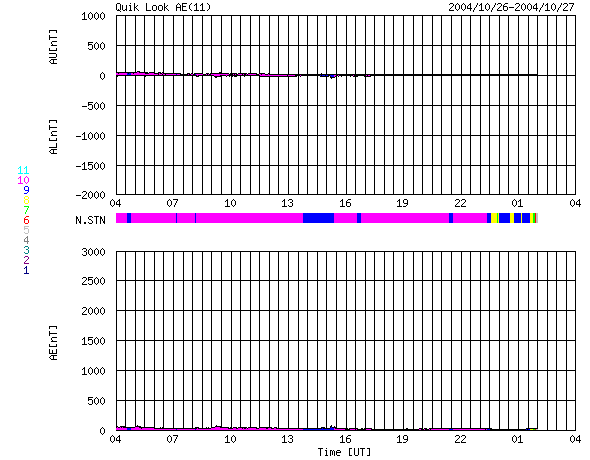 ACEが観測した太陽風の磁場(1番上の枠、白線は全体の強度、赤線は南北成分) および、太陽風の密度(3番目の橙線)、速度(4番目の黄線) (c) NOAA/SEC ![]() リアルタイムAE指数 下段のAEグラフの値が高くなると、オーロラ活動が活発化しています。 (c) 京都大学, NICT ![]() GOES衛星の太陽X線データ (c) NOAA/SEC ![]() SOHO衛星のMDIカメラによる太陽黒点 (c) SOHO (ESA & NASA) ![]() | ||||||||||||||||||||||||||||||||||||||||