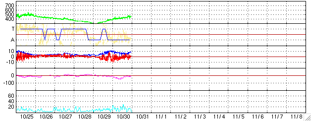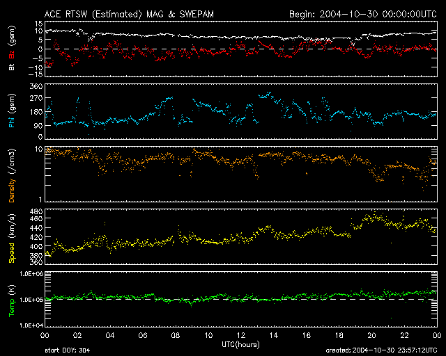 GOES衛星の太陽X線データ (c) NOAA/SEC ![]() SOHO衛星のMDIカメラによる太陽黒点 (c) SOHO (ESA & NASA) ![]() GOES衛星の太陽放射線データ (c) NOAA/SEC ![]() ACEが観測した太陽風の磁場(1番上の枠、白線は全体の強度、赤線は南北成分) および、太陽風の密度(3番目の橙線)、速度(4番目の黄線) (c) NOAA/SEC ![]() 27日の太陽周期に合わせたデータプロット (太陽風版) 太陽が同じ面を地球に向けていた27日前の変化から、今後を予想することができます。 (c) NICT