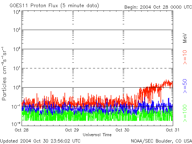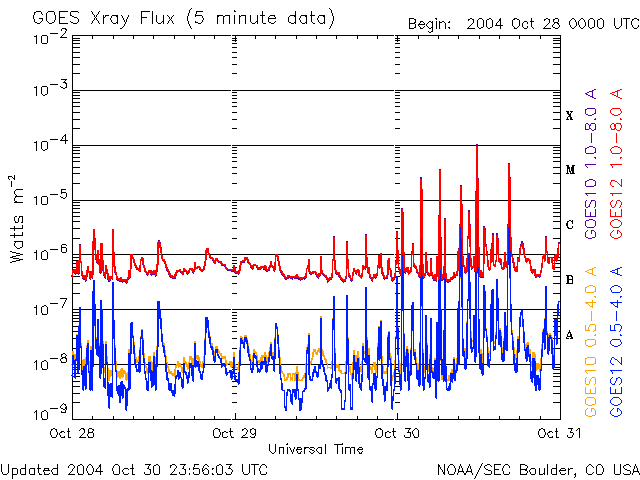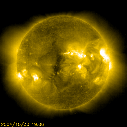 2004/10/31 08:58 更新 691黒点群が急激に活発化し、大規模フレアを起こしています。オーロラの活動も続いています。 担当 篠原 昨日のニュースでM1(C9.7に修正されました)の中規模フレアが発生したとお伝えしましたが、 それ以降691黒点群が急激に活発化し、 X1.1の大規模フレア(30日20時半、世界時30日11時半)を最大に、 Mクラスの中規模フレアを4回、Cクラスの小規模フレアを13回起こしています。 その活発な活動の様子をGOES衛星X線画像の動画で見る事ができます。 ファイルサイズが2MBありますが、是非ご覧下さい。 今後も大・中規模フレアに対する注意が必要です。 一方で、693黒点群も規模が拡大していますので、こちらに対する注意も必要かもしれません。 この一連のフレア活動の中で高エネルギーの太陽プロトンの密度が増加しています。 警戒レベルには達していませんが、今後の変化に注意が必要です。 太陽風は緩やかに速度の上昇を続け、450km/秒に達しています。 磁場強度は10nTから一旦5nTに下がりましたが、現在は再び10nTに達しつつあります。 この事から、引き続き太陽風が上昇を続ける可能性もあります。 昨日解説をしました27日周期の図をご覧下さい。 太陽風速度(1列めの緑色線)と磁場強度(3列めの青線)の変化の様子が、 半日ほど遅れて前周期と同様の傾向を示している事が確認できます。 ただし、速度も磁場強度も前周期より今回の方がより強くなっています。 磁場強度の再上昇も共に見られている事から、高速太陽風はもう2日半ほど続きそうです。 高速風と磁場変化の影響で、オーロラ活動は活発な状態が続いています。 AE指数を見ると、最大で1000nTに達する激しい活動が1回と、 500nT前後の小規模の活動が連続的に現れています。 磁場強度が再び強まりつつある事から、今後も活動が続く可能性があります。 ただし、高速太陽風と言っても、450km/秒という速度はやや速いという程度です。 大規模な磁気嵐など、激しい擾乱に発達する事はないでしょう。 SOHO EIT284の太陽画像を見ると、 太陽の中心にコロナホール(黒く裂け目の様に見えている部分です)が見えています。 3〜4日後にこの領域の影響が地球に及び始めるでしょう。 SOHO衛星のEIT284カメラの映像 (c) SOHO (ESA & NASA)
