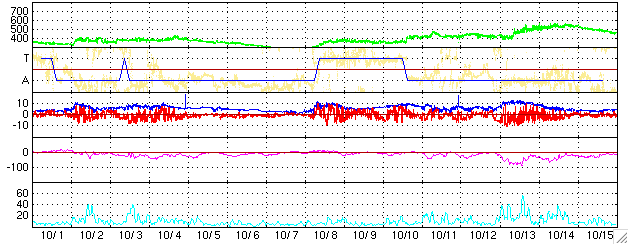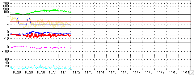 GOES衛星の太陽X線データ (c) NOAA/SEC ![]() SOHO衛星のMDIカメラによる太陽黒点 (c) SOHO (ESA & NASA) ![]() GOES衛星の太陽放射線データ (c) NOAA/SEC ![]() ACEが観測した太陽風の磁場(1番上の枠、白線は全体の強度、赤線は南北成分) および、太陽風の密度(3番目の橙線)、速度(4番目の黄線) (c) NOAA/SEC ![]() リアルタイムAE指数 下段のAEグラフの値が高くなると、オーロラ活動が活発化しています。 (c) 京都大学, NICT ![]() 27日の太陽周期に合わせたデータプロット (太陽風版) 太陽が同じ面を地球に向けていた27日前の変化から、今後を予想することができます。 (c) NICT