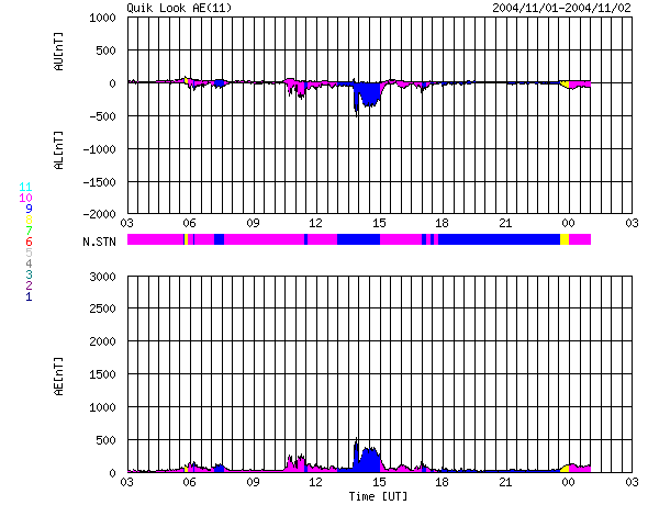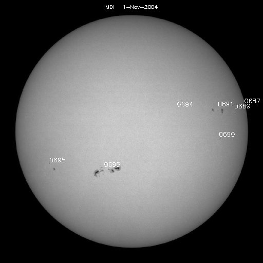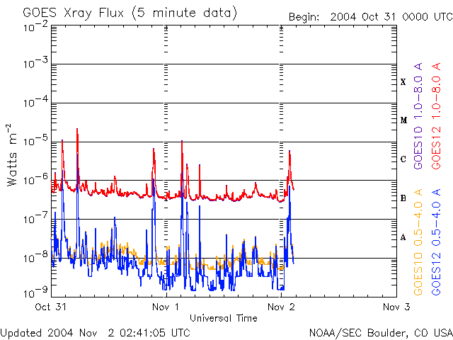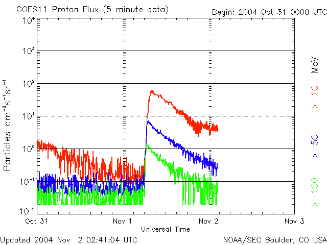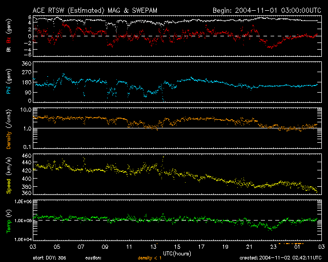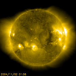 2004/11/ 2 11:41 更新 フレア活動は落ち着いて来ました。太陽風の速度は下がり、磁気圏は静穏です。 担当 篠原 691黒点群は規模を縮小しつつあり、フレア(太陽爆発)の活動は低下しています。 一方、693黒点群は規模は維持しているのですが、現在はフレア活動はほとんど起こしていません。 今後も、中規模フレア、あるいは大規模フレアに対する注意が必要とのことですが、 現在はやや落ち着いている状態です。 昨日、1日15時(世界時1日6時)頃から、 静止軌道における(GOES衛星の観測)太陽からの高エネルギープロトン(太陽放射線)の密度が増加し、 1日17時(世界時1日8時)頃に最大55PFUに達するプロトンイベントが発生しました。 高エネルギープロトンの密度は12時間ほどかけて緩やかに低下し、 現在は警報レベル(10PFU)を下回っています。 ACE衛星の観測によると、太陽風の速度は380km/秒に低下しています。 今回の高速風の領域は抜けつつある様です。 磁気圏も穏やかになり、AE指数のグラフでは小さなオーロラ活動が見られている程度です。 今後の変化ですが、 昨日お知らせしていた太陽の活発な活動による高速の太陽風が地球に届く可能性がまだ残っています。 今日一日注意が必要でしょう。 また、SOHO EIT284に見えているコロナホールの影響が、 明日、明後日頃から地球に及ぶと予想されます。 太陽風の磁場の強度が強まり、速度が上昇します。 磁気圏ではオーロラの活動が活発化する可能性があります。 SOHO衛星のEIT284カメラの映像 (c) SOHO (ESA & NASA)