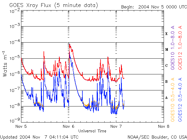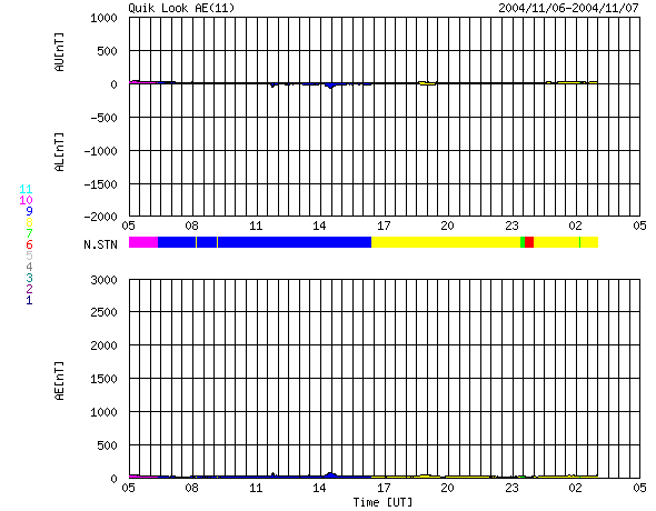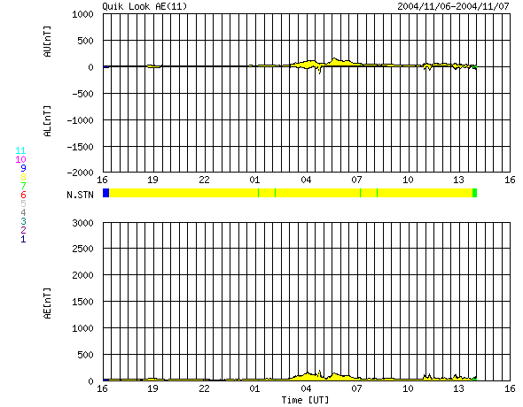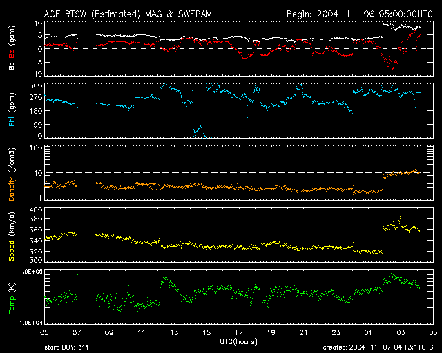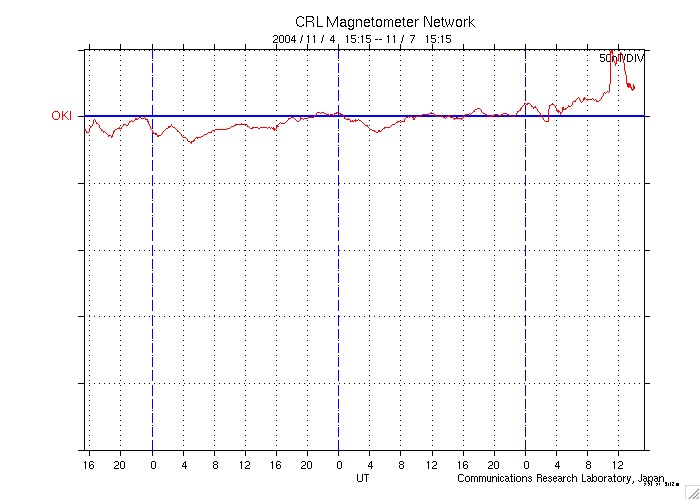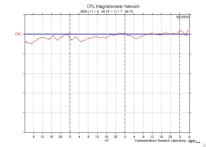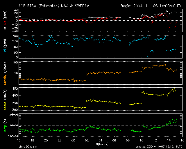 ACEが観測した太陽風の磁場(1番上の枠、白線は全体の強度、赤線は南北成分) および、太陽風の密度(3番目の橙線)、速度(4番目の黄線) (c) NOAA/SEC ![]() 沖縄の磁場擾乱 下へ下がるほど、擾乱が発達している事を意味します。 (c) NICT ![]() リアルタイムAE指数 下段のAEグラフの値が高くなると、オーロラ活動が活発化しています。 (c) 京都大学, NICT ![]() GOES衛星の太陽X線データ (c) NOAA/SEC ![]() SOHO衛星のMDIカメラによる太陽黒点 (c) SOHO (ESA & NASA) ![]() 2004/11/ 8 00:11 追加 ACEが観測した太陽風の磁場(1番上の枠、白線は全体の強度、赤線は南北成分) および、太陽風の密度(3番目の橙線)、速度(4番目の黄線) (c) NOAA/SEC ![]() 沖縄の磁場擾乱 下へ下がるほど、擾乱が発達している事を意味します。 (c) NICT ![]() リアルタイムAE指数 下段のAEグラフの値が高くなると、オーロラ活動が活発化しています。 (c) 京都大学, NICT ![]() | ||||||||||||||||||||||||||||||||||||||||
