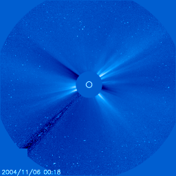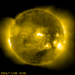 2004/11/ 7 13:11 更新 小規模の衝撃波が地球に届きました。磁気圏への影響は小さいでしょう。696黒点群は活発です。 2004/11/ 8 00:11 追加 衝撃波の第二波が地球に届きました。太陽風磁場が大きく南を向き始めています。磁気圏が乱れそうです。 担当 篠原 ACE衛星が7日11時(世界時7日2時)に太陽風の衝撃波の到来を捉えました。 とても小規模の衝撃波で、太陽風の速度は320km/秒から 360km/秒に上昇した程度です。 磁場強度は5nTから一時的に10nT近くに上がりましたが、その後は8nT程度に収まっています。 沖縄の磁場変化を見ると、7日12時(世界時7日3時)に衝撃波に関係する小幅の磁場増加が観測されています。 速度の上昇が小幅ですので、地球への影響は小さいでしょう。 磁場強度はやや強まっていますので、南向きになると一時的にオーロラが活発になるかもしれません。 この高速風の第一波は、4日0時半(世界時3日15時半)のM5.0のフレアと関係したものだと思われます。 引き続いて、5日8時(世界時4日23時)のM5.4フレアによる高速風、 6日9時(世界時6日0時)のM9.3フレアによる高速風(full halo CMEの動画をご覧下さい)が到来すると予想されます。 太陽風の変化に注意して下さい。 696黒点群は規模を維持したまま、中小規模のフレアを起こし続けています。 今朝、7日4時半(世界時19時半)にM1.4の中規模フレアを起こしています。 今後も696群のフレア活動に対する注意が必要でしょう。 696黒点群は肉眼で見える大きさになっているという話を聞きました。 日没前の太陽が十分に暗くなった時に観望に挑戦してはいかがでしょうか。 2004/11/ 8 00:11 追加 (篠原) 関連の図はページの最後にあります 7日19時(世界時7日10時)にACE衛星で二つめの衝撃波が観測されました。 速度の上昇は今回も小幅で、340km/秒から420km/秒に上がった程度です。 地上でも7日20時(世界時7日11時)頃に磁場の急な増加が観測されています。 沖縄のデータをご覧下さい。 衝撃波到来直後は、太陽風の磁場が北寄りだったため、 磁気圏への影響はほとんどみられませんでした。 しかし、7日23時(世界時7日14時)頃から南寄りに傾向が変わり始め、 現在は-20nTとかなり強い南向きが現れています。 このまま南寄りが続いた場合、オーロラ活動が急に活発になるでしょう(現在は静穏です)。 太陽風の速度が450km/秒を切る程度なので、大規模な擾乱になる事はないでしょうが、 弱い磁気嵐に発達するかもしれません。 今後の変化に注意して下さい。 SOHO EIT195カメラが捉えた、11月6日9時(世界時6日0時)のM9.3の太陽フレア。 (c) NOAA/SEC ![]() SOHO LASCO C3カメラが捉えた、このフレアに伴うCMEの様子。太陽を取り囲む様にガスが広がって見えている。 (c) NOAA/SEC ![]() SOHO衛星のEIT284カメラの映像 (c) SOHO (ESA & NASA)