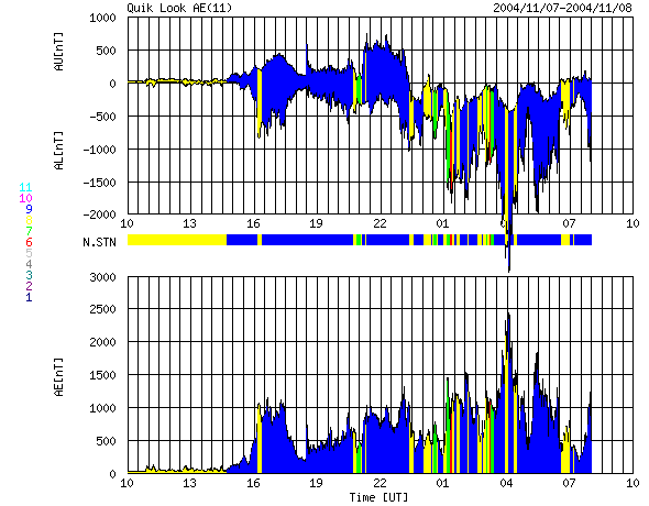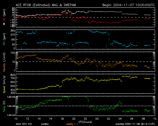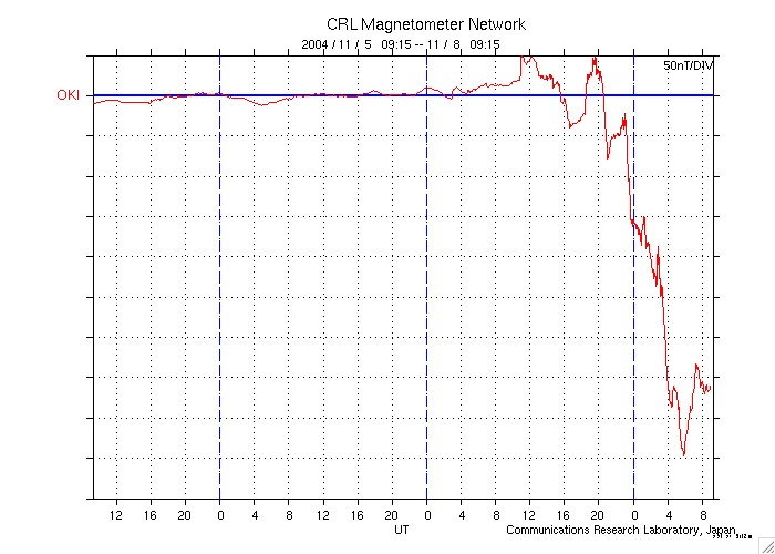 2004/11/ 8 18:11 更新 磁気嵐が非常に強く発達しています。北海道で低緯度オーロラが観測される可能性もあります。 2004/11/ 8 21:06 追加 今回の磁気嵐について関連情報をまとめたページを作製しました。 担当 篠原 太陽風の磁場がとても強く南を向いた状態が継続し、磁気嵐が非常に強く発達しています。 今朝のニュースで-40nTに達する太陽風磁場の強い南向きについてお知らせしましたが、 その後、この強い南向きは8日13時半(世界時4時半)まで約6時間に渡って続きました。 太陽風の速度も650km/秒と速かったため、磁気圏へ激しくエネルギーが流れ込み、 オーロラ活動が非常に活発になりました。 AE指数のグラフを見ると、1500nTから2500nTに達する様な変動が観測されています。 ここまで磁気圏が乱れると、オーロラは通常の位置を外れてより低い緯度で輝く様になります。 このため、AE指数の観測にも誤差が生じ、正しくオーロラの活動度を捉える事ができなくなります。 恐らく、本当のオーロラ活動の度合いはもっと激しかったのではないかと思われます。 磁気嵐としても非常に大きく発達しています。 沖縄の磁場変化をご覧下さい。8日15時(世界時8日6時)頃に、静穏レベル(青い横線)から-450nTに達する、 非常に激しい磁場の低下が観測されています。 磁場の低下の幅が大きいほど、磁気嵐は激しく発達をしています。 変化の幅は、昨年の11月の大磁気嵐に匹敵するものです。 昨年の例を参考にすると、今夜は北海道など北よりの地域でオーロラが観測できるかもしれません。 オーロラと言っても日本の様な低緯度では、赤いぼんやりとした光が観測されると考えて下さい。 ACE衛星の観測データを見ると、8日13時半(世界時4時半)頃lから太陽風の様子が変わり、 速度は750km/秒に増加したのですが、南向き磁場が-20nTへ弱まってしまいました (通常レベルと比べると、大変強いのですが)。 南向き磁場はその後も緩やかに弱まり続け、現在は-10nT程度になってしまった様です。 磁気圏の擾乱としては、これで一息つけそうです。 逆に、低緯度オーロラの観望としてはやや不利な条件になってしまいました。 観測に成功された方は、宇宙天気ニュースへ是非お知らせ下さい。 2004/11/ 8 21:06 追加 (篠原) 関連の図はページの最後にあります 今晩日本でもオーロラが!? 宇宙嵐に関する臨時情報(11月7日16時発表)を作製しました。どうぞご覧下さい。 ACEが観測した太陽風の磁場(1番上の枠、白線は全体の強度、赤線は南北成分) および、太陽風の密度(3番目の橙線)、速度(4番目の黄線) (c) NOAA/SEC ![]() リアルタイムAE指数 下段のAEグラフの値が高くなると、オーロラ活動が活発化しています。 (c) 京都大学, NICT ![]() 沖縄の磁場擾乱 下へ下がるほど、擾乱が発達している事を意味します。 (c) NICT ![]() 2004/11/ 8 21:06 追加 | |||||||||||||||||||||||||||||||||||||||