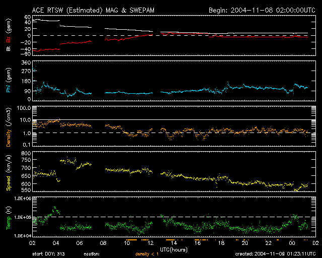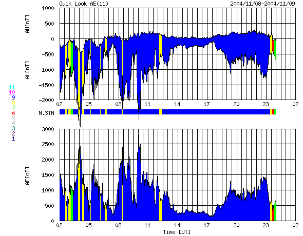 ACEが観測した太陽風の磁場(1番上の枠、白線は全体の強度、赤線は南北成分) および、太陽風の密度(3番目の橙線)、速度(4番目の黄線) (c) NOAA/SEC ![]() リアルタイムAE指数 下段のAEグラフの値が高くなると、オーロラ活動が活発化しています。 (c) 京都大学, NICT ![]() 沖縄の磁場擾乱 下へ下がるほど、擾乱が発達している事を意味します。 (c) NICT ![]() GOES衛星の太陽放射線データ (c) NOAA/SEC ![]() GOES衛星の太陽X線データ (c) NOAA/SEC ![]() SOHO衛星のMDIカメラによる太陽黒点 (c) SOHO (ESA & NASA) ![]() | ||||||||||||||||||||||||||||||||||||||||