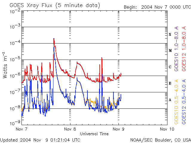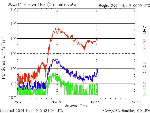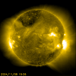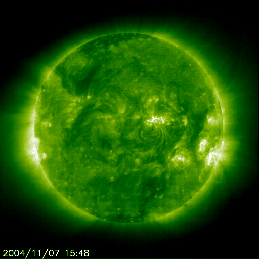 2004/11/ 9 10:21 更新 昨夜は北海道でオーロラが観測されました。今回の磁気嵐は静まりつつありますが、今夜にかけて次の衝撃波が来るでしょう。 担当 篠原 初めに、昨日の情報ですが、 今晩日本でもオーロラが!? 宇宙嵐に関する臨時情報(11月7日16時発表)を作製しました。参考にご覧下さい。 昨夜、8日の夜に北海道で低緯度オーロラが観測された様です。 ネットで見つけた観測報告を2カ所ご紹介します。 陸別町銀河の森天文台 名寄市立木原天文台 観測記録をお持ちの方がいらっしゃいましたら、宇宙天気ニュース(m_shino@nict.go.jp)へぜひお知らせ下さい。 太陽風の現在の状態は、速度570km/秒、磁場強度約10nT、南向き磁場約-5nTです。 依然擾乱状態であり、AE指数を見てもオーロラ活動は1000nT前後のたいへん活発な活動を続けています。 しかし、今回の大擾乱としては既に終わりを迎えています。 沖縄の磁場変化を見ると、8日15時(世界時8日6時)頃に静穏レベル(青い横線)から-450nTに及ぶ 非常に大規模な磁場の低下(磁気嵐の発達を示している)が見られましたが、 その後は回復傾向にあり、現在は-120nT程度にまで戻っています。 一旦磁気嵐は終息を迎えつつありますが、 続いて昨日、8日1時(世界時7日16時)頃に発生したX2.0の大規模フレアによる擾乱が地球を襲いそうです。 今日の画像の1、2枚目に、このフレアが発生した時の太陽画像の動画を掲載しています。 太陽全体の動画では、爆発の爆風(?)の影響が画面全体に広く及んでいる様子がうかがえます。 3枚目の写真は、このフレアに伴って発生したhalo CME(太陽ガスの放出現象)の様子です。 この時飛び出した高速の太陽ガスが地球方向へ向かっていると予想されています。 これから今夜にかけて、再び大規模な太陽風擾乱の始まりを迎えるでしょう。 太陽風の速度が高まり、磁場強度が強まるでしょう。 太陽風が運んで来る磁場が強く南を向いていた場合は、 昨日と同様の非常に大きな磁気嵐やオーロラ活動をもたらす可能性があります。 引き続き警戒が必要です。 北海道など北寄りの地域では、再び低緯度オーロラのチャンスが巡って来るかもしれませんので、 最新の情報に注意して下さい。 このX2.0フレアに伴って増加していた太陽の高エネルギープロトンは減少傾向にありますが、 続いて起こったフレアの影響もあってか、100PFU程度の高いレベルを保っています。 衛星運用ではこちらも警戒が必要です。 太陽黒点の696群はいよいよ縮小の時期を迎えたようです。 規模がやや小さくなっています。 SOHO EIT195カメラが捉えた、11月8日1時(世界時7日16時)のX2.0の太陽フレア。 (c) SOHO (ESA & NASA) ![]() SOHO EIT195カメラが捉えた、11月8日1時(世界時7日16時)のX2.0の太陽フレア。一部を拡大。 (c) SOHO (ESA & NASA) ![]() SOHO LASCO C3カメラが捉えた、このフレアに伴うCMEの様子。太陽を取り囲む様にガスが広がって見えている。 (c) SOHO (ESA & NASA) ![]() SOHO衛星のEIT284カメラの映像 (c) SOHO (ESA & NASA)