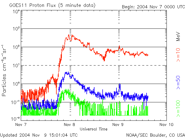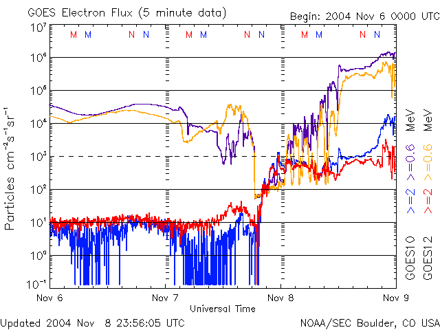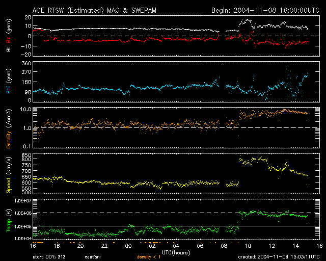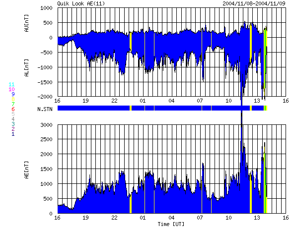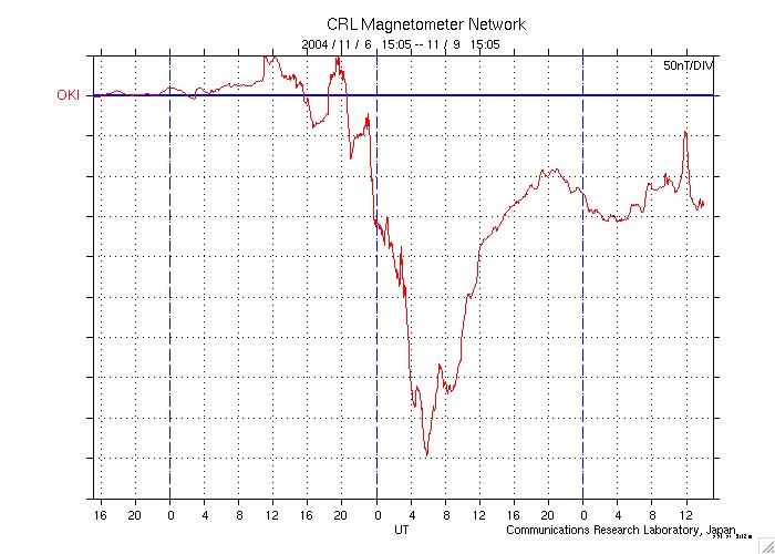 2004/11/10 00:01 更新 18時半(世界時9時半)に衝撃波が来ました。低緯度オーロラは難しいかもしれませんが、オーロラ活動は非常に活発です。 担当 篠原 ACE衛星の観測によると、9日18時(世界時9日9時)頃に、予想されていた新たな衝撃波が到来しました。 太陽風の速度は800km/秒に急増しましたが、磁場強度は10〜15nTに増加した程度です。 磁気圏擾乱の要因としては十分な規模を持った衝撃波ですが、 昨日の様な、大規模な擾乱には現時点では発達しそうにありません。 地球へは18時半(世界時9時半)頃に影響が及び始めました。 昨日の大磁気嵐の印象が強いため、貧弱に見えてしまいますが、 現在もオーロラを中心として非常に活発な活動が続いています。 太陽風の磁場の南北成分を見ると、昨日の擾乱以降-5nT規模の南向き状態が継続していました。 このため、AE指数を見ると、1000nTを越える活発な活動がほぼ一日続いています。 新たな衝撃波到来後も、太陽風磁場は-5〜-10nTへ南向きが強まっており、 AE指数は2500nTに達する様な非常に激しい活動を見せています。 アラスカで撮影されたばかりのオーロラ画像を掲載します。 沖縄の磁場変動を見ると、青線で示している静穏時の値から-150nT程度下がった状態が続いていて、 磁気嵐としては十分発達した状態です。 昨日の磁気嵐の発達は10年に数度の様な大規模現象だったのです。 今後、太陽風が高速かつ南向き状態が続く間、磁気圏はとても活発に活動を続けるでしょう。 速度は既に650km/秒程度に下がり始めていますが、まだ十分に高速です。 今後の太陽風の変化に注意して下さい。 GOES衛星の観測によると、太陽からの高エネルギープロトンは現在も40PFUの高いレベルを保っています。 また、放射線帯の高エネルギー電子も警戒ラインと言われる10の4乗を越えた状態に達しています。 衛星運用では、これらの情報にも注意して下さい。 アラスカのライブカメラで撮影されたオーロラの動画。 (c) NICT/SALMON ![]() ACEが観測した太陽風の磁場(1番上の枠、白線は全体の強度、赤線は南北成分) および、太陽風の密度(3番目の橙線)、速度(4番目の黄線) (c) NOAA/SEC ![]() リアルタイムAE指数 下段のAEグラフの値が高くなると、オーロラ活動が活発化しています。 (c) 京都大学, NICT ![]() 沖縄の磁場擾乱 下へ下がるほど、擾乱が発達している事を意味します。 (c) NICT ![]() GOES衛星による、静止衛星軌道における高エネルギー電子の変化 (c) NOAA/SEC ![]() GOES衛星の太陽放射線データ (c) NOAA/SEC ![]() | |||||||||||||||||||||||||||||||||||||||