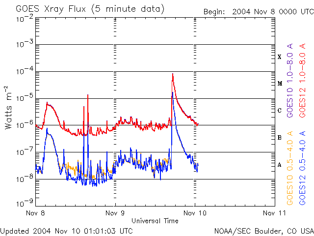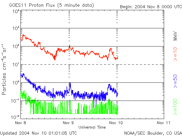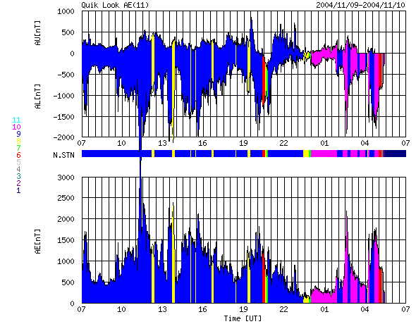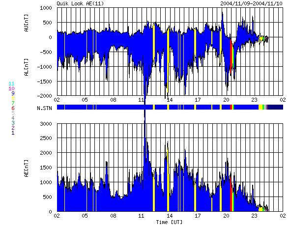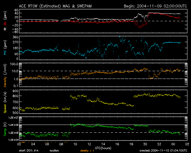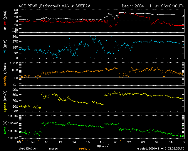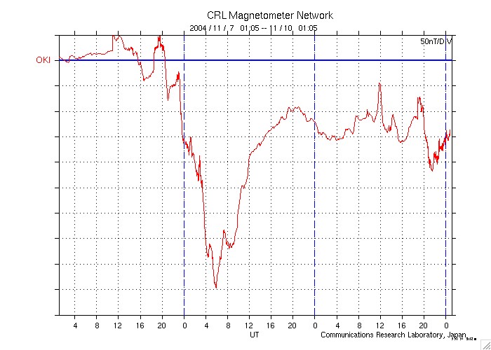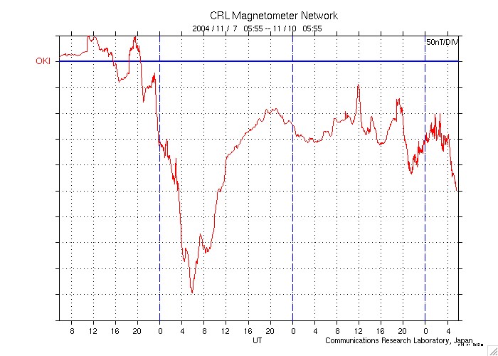 ACEが観測した太陽風の磁場(1番上の枠、白線は全体の強度、赤線は南北成分) および、太陽風の密度(3番目の橙線)、速度(4番目の黄線) (c) NOAA/SEC ![]() 沖縄の磁場擾乱 下へ下がるほど、擾乱が発達している事を意味します。 (c) NICT ![]() リアルタイムAE指数 下段のAEグラフの値が高くなると、オーロラ活動が活発化しています。 (c) 京都大学, NICT ![]() GOES衛星の太陽X線データ (c) NOAA/SEC ![]() SOHO衛星のMDIカメラによる太陽黒点 (c) SOHO (ESA & NASA) ![]() GOES衛星の太陽放射線データ (c) NOAA/SEC ![]() 2004/11/10 15:00 追加 ACEが観測した太陽風の磁場(1番上の枠、白線は全体の強度、赤線は南北成分) および、太陽風の密度(3番目の橙線)、速度(4番目の黄線) (c) NOAA/SEC ![]() リアルタイムAE指数 下段のAEグラフの値が高くなると、オーロラ活動が活発化しています。 (c) 京都大学, NICT ![]() 沖縄の磁場擾乱 下へ下がるほど、擾乱が発達している事を意味します。 (c) NICT ![]() | ||||||||||||||||||||||||||||||||||||||||
