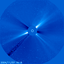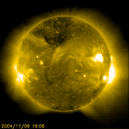 2004/11/10 10:05 更新 更に新しい衝撃波が来ました。磁場強度が非常に強く、午後から南向きになって大きく磁気嵐を発達させそうです。 2004/11/10 15:00 追加 太陽風の磁場が強い南向きに変わりました。磁気嵐が再び発達を始めており、低緯度オーロラの可能性もあります。 担当 篠原 今晩日本でもオーロラが!? 宇宙嵐に関する臨時情報(11月10日17時更新)を作製しました。参考にご覧下さい。 10日3時半(世界時9日18時半)にACE衛星で新たな衝撃波が観測されました。 太陽風の速度は650km/秒から800km/秒と大変速い速度に増加しました。 この直後に磁場が-20nTと大きな南向きになりました。 この衝撃波は10日4時(世界時8日19時)頃地球に到達しています。 沖縄で40nT近い磁場増加が観測されました(他の変動が激しいため、図では見つけにくいかもしれません)。 この衝撃波は8日12時半(世界時8日3時半)に発生したC7.9の小規模フレアに伴って発生した halo CME(太陽ガスの放出現象)によるものと思われます。 ACE衛星で昨夕の9日18時(世界時9日9時)頃に観測した衝撃波は 8日1時(世界時7日16時)頃に発生したX2.0の大規模フレアによるものです。 フレアの時間間隔が11時間半、衝撃波の時間間隔が9時間半ということで、時間的にも良い一致をしていると思います。 SOHO衛星のLASCO C3カメラが捉えていた、これらのCMEの動画を掲載します。 初めの明るいCME(ガスの放出)の後(この部分の動画は昨日掲載していました)、 動画の最後近くに、太陽全体を取り囲む様な淡いガスの放出が撮影されています。 これが今朝の衝撃波の原因でしょう。 今回の衝撃波で注目すべきは、10日5時半(世界時8日20時半)以降の太陽風磁場の様子です。 -20〜-30nTと大きく南を向いていた太陽風の磁場が、 この時刻に急に北向きになり、強度も40nTに強まっています。 その後、南北成分(赤線)が次第に弱まって来て、現在は20nTに下がっていることが分かります。 これは、太陽風磁場の南北成分が北向きから南向きへぐるっと回転しつつあることを示しています。 恐らく今日の午後辺りから、磁場は南向きに切り替わり、その後夕方にかけて更に南向きを強めて行くと思われます。 その時点で磁場強度がどのくらいあるか、また太陽風の速度がどのくらいあるかが問題となりますが、 両者が非常に強い値を保っていた場合は、再び今夜にかけて磁気嵐が大きな発達を遂げる可能性があります。 再び低緯度オーロラが観測される可能性もあると思います。 これからの太陽風磁場、速度の変化に注目して下さい。 さて、現在の状況ですが、AE指数は観測システムが壊れたのではないかと思われる様な、 非常に激しい現象で一日が埋め尽くされています。 1000〜1500nT、時に2000nTを越える様な非常に激しいオーロラ活動を観測し続けています。 沖縄の磁場変化を見ると、減衰し始めていた磁気嵐(赤線が上昇し、青の横線に近づく)が、 再び強まりそうな気配を見せています(赤線が再び下がり始めている)。 現在は太陽風磁場が北を向いているため、磁気圏擾乱は一旦収まる方向に向かいますが、 今後、太陽風磁場南北成分の切り替わりによって再び大きく変化するでしょう。 太陽では696黒点群が新たに大きな活動を起こしています。 10日2時(世界時9日17時)にM8.9の大きな中規模フレア(太陽爆発)を発生させました。 今回も長時間継続型のフレアで、CMEを起こしています。 この情報については、明日のニュースで動画を紹介したいと思います。 明日、11日の夕方から夜にかけて衝撃波が到来する可能性があります。 696黒点群が太陽面の西(右)に移動していますので、 これまでの直撃コースのCMEほどの影響は見られないかもしれません。 また、高エネルギーの太陽プロトンの密度も高い状態が続いています。 減少傾向にあるとはいえ、依然20〜40PFU程度の数値を示しています。 継続時間も長くなっていますので、衛星運用などではご注意下さい。 2004/11/10 15:00 追加 (篠原) 関連の図はページの最後にあります 10日10時(世界時10日1時)頃から、太陽風の磁場が南向き傾向に切り替わりました。 時間が経つ毎に南向きは強まり、現在は-25nT近くにまで強まっています。 太陽風の速度は750km/秒と非常に高速で、このため磁気圏は非常に活発な状態になっています。 オーロラ活動を示すAE指数では、 10日9時(世界時10日0時)頃に一時的に静かな時間帯ができていますが、 その後急激にグラフが上昇し、オーロラの活動が活発になっている事が分かります。 また、沖縄の磁場変化のグラフも磁気嵐の発達を示す、赤線の低下が始まっています。 既に静穏レベル(青の横線)から-250nTも下がっていますが、これから更に磁気嵐が発達するでしょう。 今後どの程度まで擾乱が発達するか、低緯度オーロラを呼ぶ程に発達するのか、興味が持たれます。 ACEのグラフを見ると、太陽風の磁場強度は緩やかに下がっていて、 最大だった40nTから現在は25nTに弱まっています。 長期的には時間の経過とともに太陽風の磁場強度、速度ともに弱ま