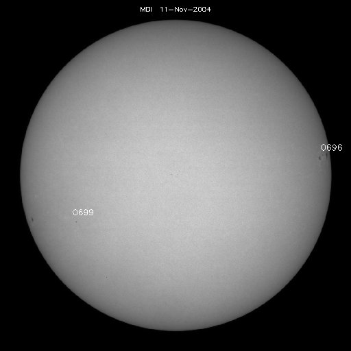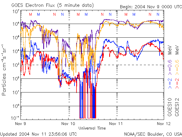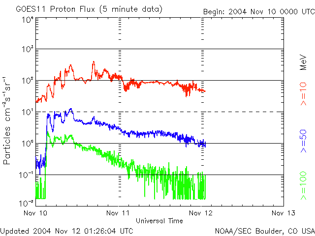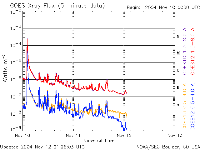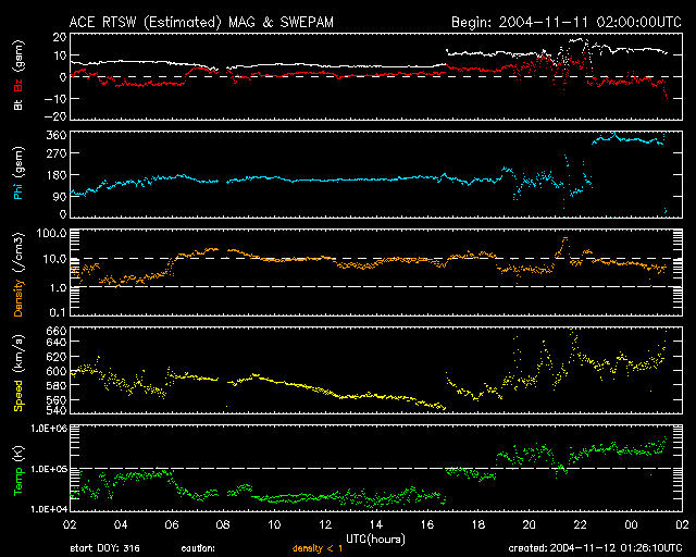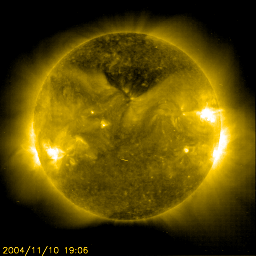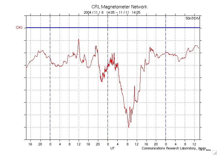 2004/11/12 10:27 更新 磁気嵐は終息に向かっています。新しい衝撃波が来ましたが、大擾乱に発達することはないでしょう。 担当 篠原 11月10日の夜に再び低緯度オーロラが観測されました。 三澤史明氏が北海道常呂郡端野町で撮影された写真をご紹介します。どうぞご覧下さい。 2004年11月の低緯度オーロラの観測報告 今回の大磁気嵐に関連して低緯度オーロラなどを観測された方は、ぜひ宇宙天気ニュースへお知らせ下さい。 10日2時(世界時9日17時)に発生したM8.9の中規模フレアによって CME(太陽ガスの放出現象)が観測されていましたが、 その影響と思われる衝撃波が、12日2時(11日17時)にACE衛星で観測されました。 太陽風の速度は550km/秒から600km/秒に再び上昇し、磁場強度は5nTから12nT程度に強まっています。 これまでの変化が大変激しかったため、小規模の太陽風擾乱に見えてしまいますが、 オーロラ活動や磁気嵐を活発化する要因として十分な強度を持っています。 これまでは太陽風磁場が北寄りの傾向をとっていたため、地球への影響はほとんどありませんでした。 しかし、その傾向がやや変わりつつあり、今後南を向いた場合は磁気圏の活動が再び活発になるでしょう。 ただし、これまでの様な大擾乱に発達することはありません。 10日11時(世界時10日2時)のX2.5の大規模フレアによって発生したCMEの影響が、 これに続いて見られると思います。 発生源の696黒点群の位置から考えて、今回の衝撃波と同程度の影響であろうと思われますが、 しばらく注意をして下さい。 現在の磁気圏の状態ですが、沖縄の磁場変化を見ると磁気嵐からかなり回復しています。 現在の磁場強度(赤線)は静穏レベル(青の横線)から-80nT程度にまで上がっています。 オーロラ活動を示すAE指数もかなり落ち着いて来ています。 変動は500nT以下となり、オーロラ活動がかなり弱まっている様です。 ただし、現在も太陽風はとても高速であり、磁場強度も強い状態ですので、 太陽風磁場の南向きが強まると、オーロラが活発化するでしょう。 太陽からの高エネルギープロトンの放射は緩やかに下がっていますが、現在も50PFUあります。 太陽放射線の高い状態が長時間続いています。 また、放射線帯の高エネルギー電子の密度も警戒レベルの10の4乗を越えた状態が続いています。 どちらも衛星への影響が心配されるデータです、引き続き警戒が必要でしょう。 太陽面では、696黒点群がいよいよ西の端に没しようとしています。 すっかり活動は弱まってしまった様で、X2.5の大規模フレア以降は目立ったフレアを発生させていません。 太陽の大擾乱も一息ついた様です。 SOHO衛星のEIT284カメラの映像 (c) SOHO (ESA & NASA)