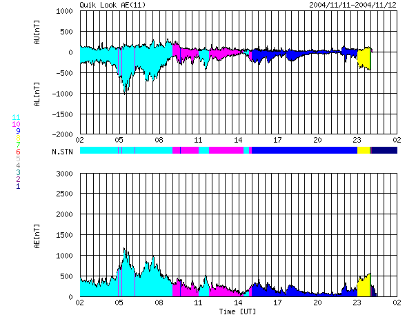 ACEが観測した太陽風の磁場(1番上の枠、白線は全体の強度、赤線は南北成分) および、太陽風の密度(3番目の橙線)、速度(4番目の黄線) (c) NOAA/SEC ![]() 沖縄の磁場擾乱 下へ下がるほど、擾乱が発達している事を意味します。 (c) NICT ![]() リアルタイムAE指数 下段のAEグラフの値が高くなると、オーロラ活動が活発化しています。 (c) 京都大学, NICT ![]() GOES衛星の太陽放射線データ (c) NOAA/SEC ![]() GOES衛星による、静止衛星軌道における高エネルギー電子の変化 (c) NOAA/SEC ![]() SOHO衛星のMDIカメラによる太陽黒点 (c) SOHO (ESA & NASA) ![]() GOES衛星の太陽X線データ (c) NOAA/SEC ![]() | ||||||||||||||||||||||||||||||||||||||||