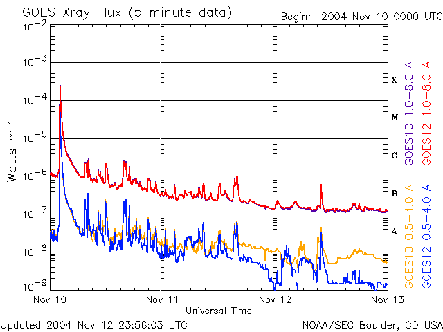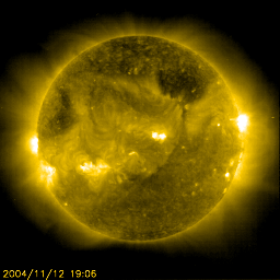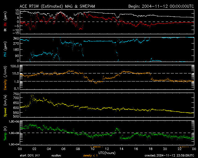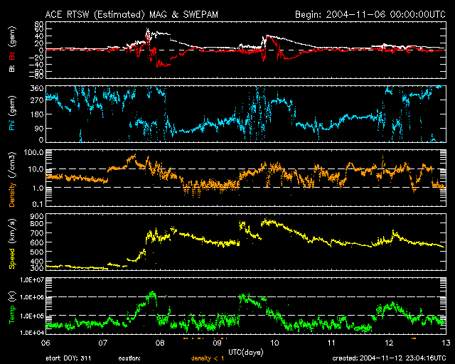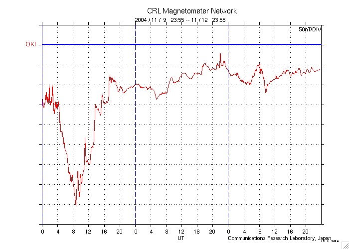 2004/11/13 09:00 更新 磁気嵐はほぼ終了しました。太陽風の速度はまだ高速で、オーロラ活動も見られています。 担当 篠原 2004年11月の低緯度オーロラの観測報告 今回の大磁気嵐に関連して低緯度オーロラなどを観測された方は、ぜひ宇宙天気ニュースへお知らせ下さい。 今日1枚めの図はこの1週間の太陽風の変化です。 今回の大擾乱の原因となった、高速かつ磁場強度の強い太陽風の変化が、 図の中の7〜8日、9〜10日に見えています(時間は世界時)。 1列めの赤線に注目して下さい。これは太陽風磁場の南北方向成分の変化です。 これがたいへん強く南を向いています(-20nTや-40nTなど)。 今回の現象では、太陽風の速度はとても高速でしたが、驚く程の速度ではありません。 磁場がとても強く南を向いた事が大擾乱の決め手となったと言ってよいでしょう。 昨日到来を予想していました、X2.5の大規模フレアと関係した高速風ですが、 12日10時(世界時12日1時)に600km/秒から700km/秒に速度の上昇が発生しています。 あるいは、これがその影響かもしれません。 あまり明確な変化ではありませんが、CME発生時の696黒点群の位置を考えると、 この程度の変動にしかならないかもしれません。 太陽風の速度はその後緩やかに減少を続け、現在は550km/秒に下がりました。 磁場強度は5nTあり、やや南を向いています。 これまでが激しかったため地味に見えますが、まだ十分高速の太陽風です。 このため、オーロラ活動もこれまでに比べるとだいぶ穏やかになりましたが、 現在も活発に500nTを越える規模の活動を続けています。 太陽風の速度がもう一段下がるまでは、オーロラ活動は続くでしょう。 沖縄の磁場変化を見ると、かなり静穏レベル(青の横線)に近づいて来ました。 磁気嵐も終息間近と言えそうです。 太陽からの高エネルギープロトン、放射線帯の高エネルギー電子の密度は ともに順調に低下を続けています。 どちらも間もなく警戒域から下がりそうです。 一連の大イベントの発生源となった696黒点群の最後の姿が黒点写真に記録されています。 新しい群が3つ見えていますが、いずれも小規模で、太陽のフレア活動は穏やかになるでしょう。 ACE衛星が観測した、過去一週間の太陽風の変化。1列めの白線が磁場強度、4列めの黄色線が速度。横軸の数字は日付になります。 (c) NOAA/SEC ![]() SOHO衛星のEIT284カメラの映像 (c) SOHO (ESA & NASA)