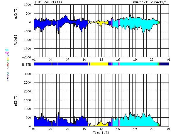 ACEが観測した太陽風の磁場(1番上の枠、白線は全体の強度、赤線は南北成分) および、太陽風の密度(3番目の橙線)、速度(4番目の黄線) (c) NOAA/SEC ![]() リアルタイムAE指数 下段のAEグラフの値が高くなると、オーロラ活動が活発化しています。 (c) 京都大学, NICT ![]() 沖縄の磁場擾乱 下へ下がるほど、擾乱が発達している事を意味します。 (c) NICT ![]() GOES衛星の太陽放射線データ (c) NOAA/SEC ![]() GOES衛星による、静止衛星軌道における高エネルギー電子の変化 (c) NOAA/SEC ![]() SOHO衛星のMDIカメラによる太陽黒点 (c) SOHO (ESA & NASA) ![]() GOES衛星の太陽X線データ (c) NOAA/SEC ![]() | ||||||||||||||||||||||||||||||||||||||||