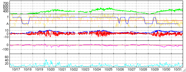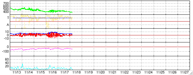 ACEが観測した太陽風の磁場(1番上の枠、白線は全体の強度、赤線は南北成分) および、太陽風の密度(3番目の橙線)、速度(4番目の黄線) (c) NOAA/SEC ![]() リアルタイムAE指数 下段のAEグラフの値が高くなると、オーロラ活動が活発化しています。 (c) 京都大学, NICT ![]() 27日の太陽周期に合わせたデータプロット (太陽風版) 太陽が同じ面を地球に向けていた27日前の変化から、今後を予想することができます。 (c) NICT